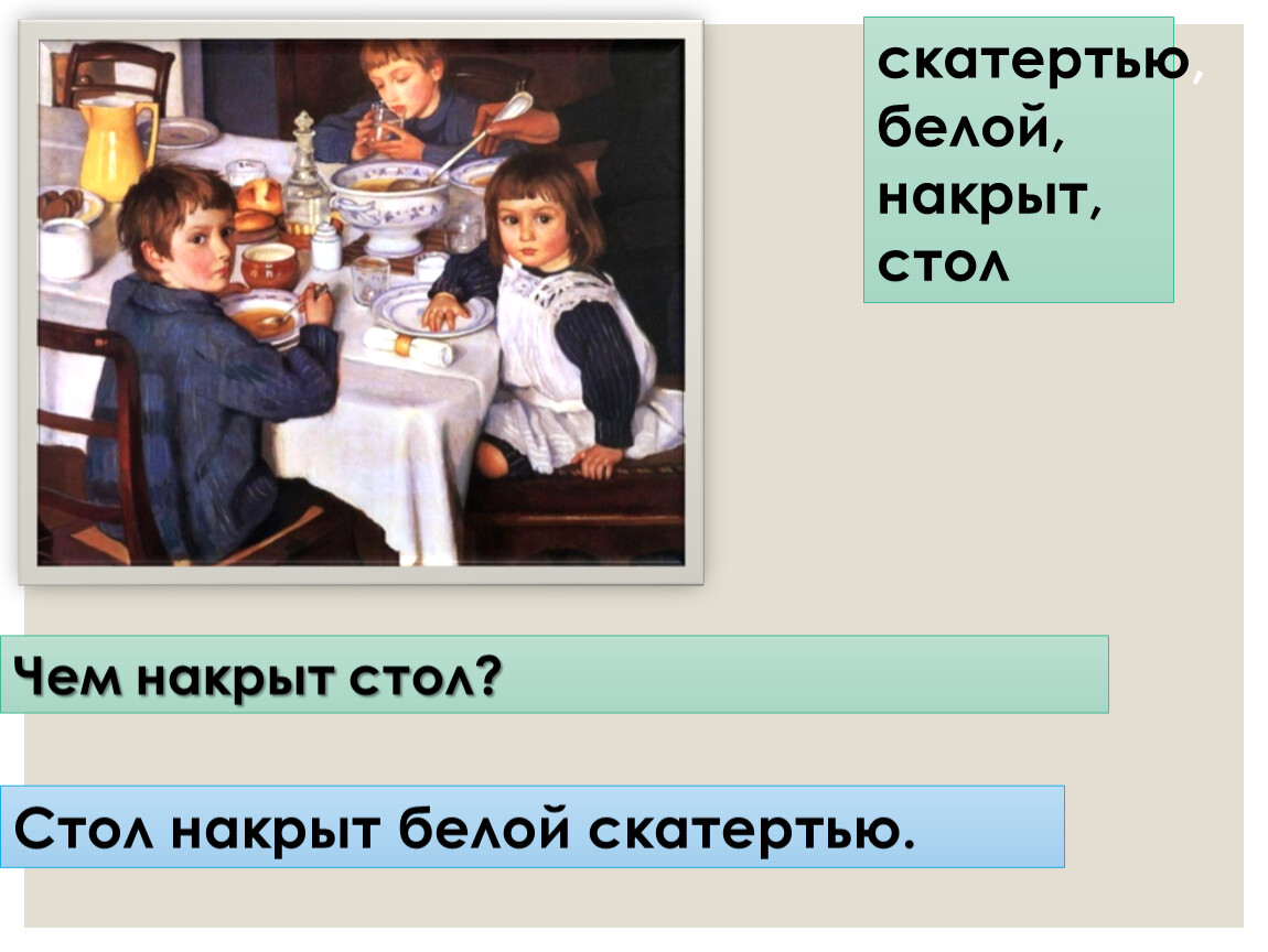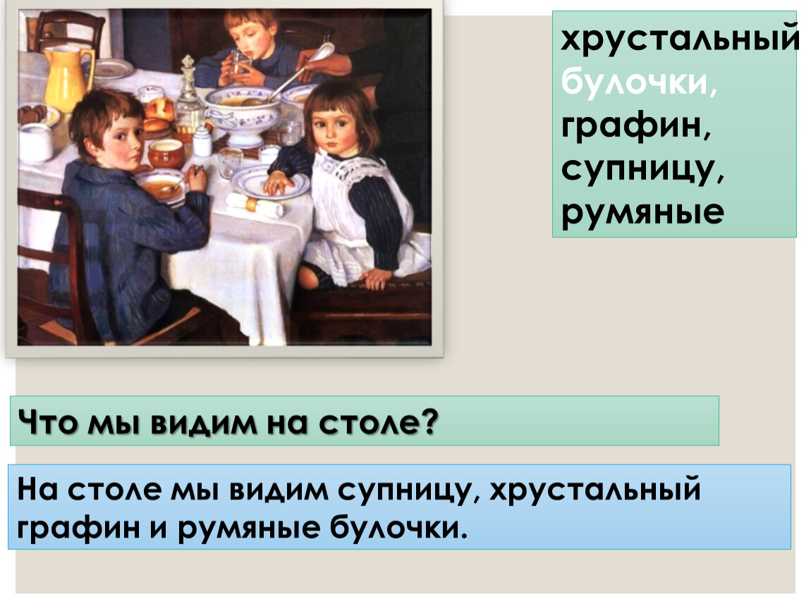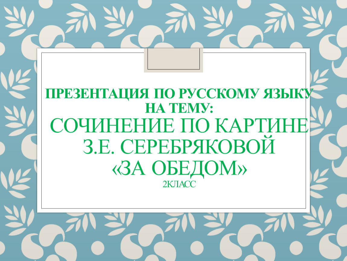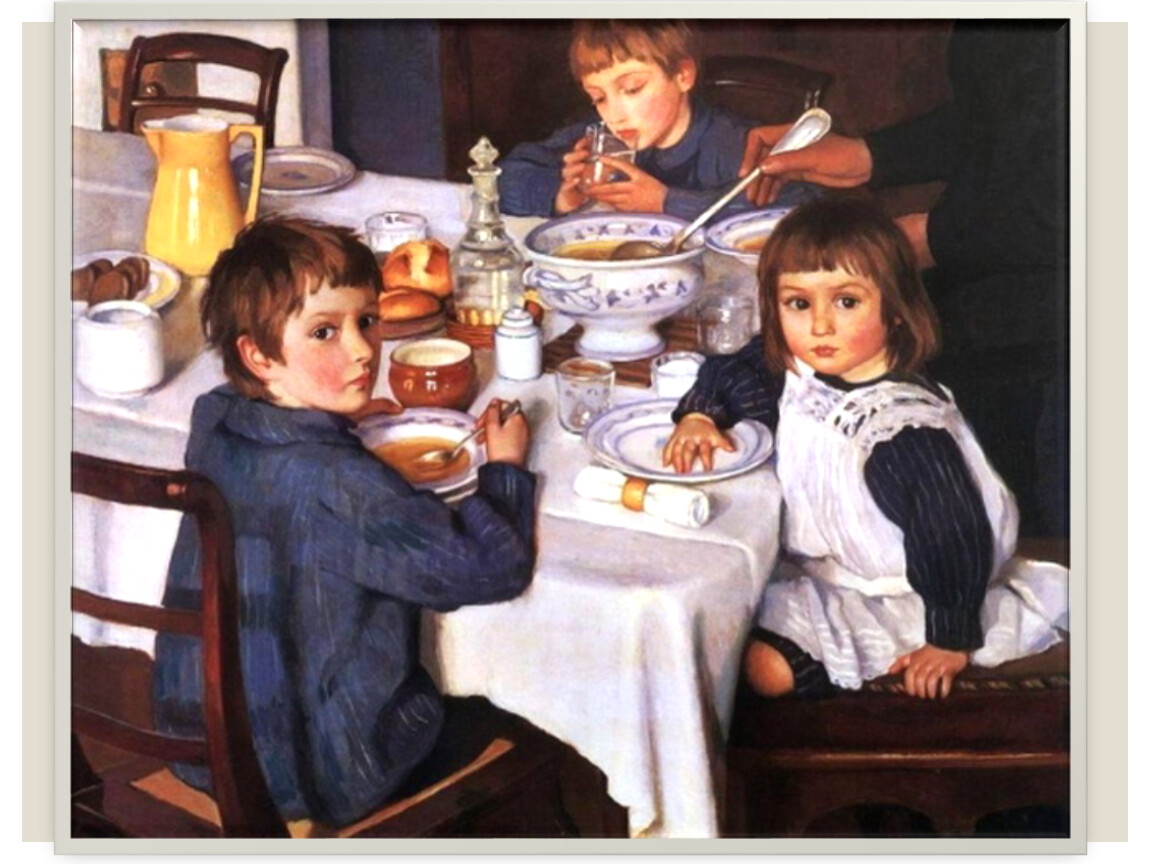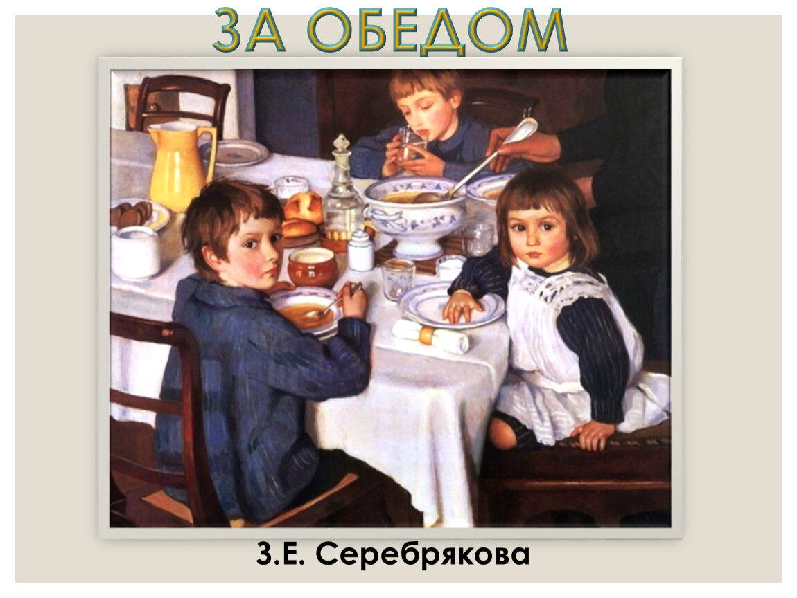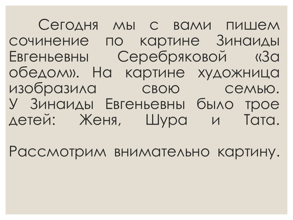 Сегодня мы с вами пишем сочинение по картине Зинаиды Евгеньевны Серебряковой «За обедом». На картине художница изобразила свою семью. У Зинаиды Евгеньевны было трое детей: Женя, Шура и Тата.Рассмотрим внимательно картину.