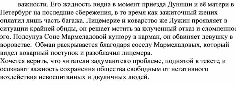 Нельзя не согласиться с позицией автора. Действительно, лицемерие и коварство отравляют жизнь общества, и для сохранения целостности общества необходимо им противостоять. В романе Ф.М. Достоевского «Преступление и наказание» обладателем таких качеств является жених сестры главного героя – Пётр Лужин. Он создаёт вид доброго и интеллигентного человека, хотя его характер и личностные черты говорят об обратном. Он тщеславен, ведь делает предложение бедной девушке ради собственного утешения и чувства важности. Его жадность видна в момент приезда Дуняши и её матери в Петербург на последние сбережения, в то время как зажиточный жених оплатил лишь часть багажа. Лицемерие и коварство же Лужин проявляет в ситуации крайней обиды, он решает мстить за полученный отказ и сломленное эго. Подсунув Соне Мармеладовой купюру в карман, он обвиняет девушку в воровстве. Обман раскрывается благодаря соседу Мармеладовых, который видел коварный поступок и разоблачил лицемера.