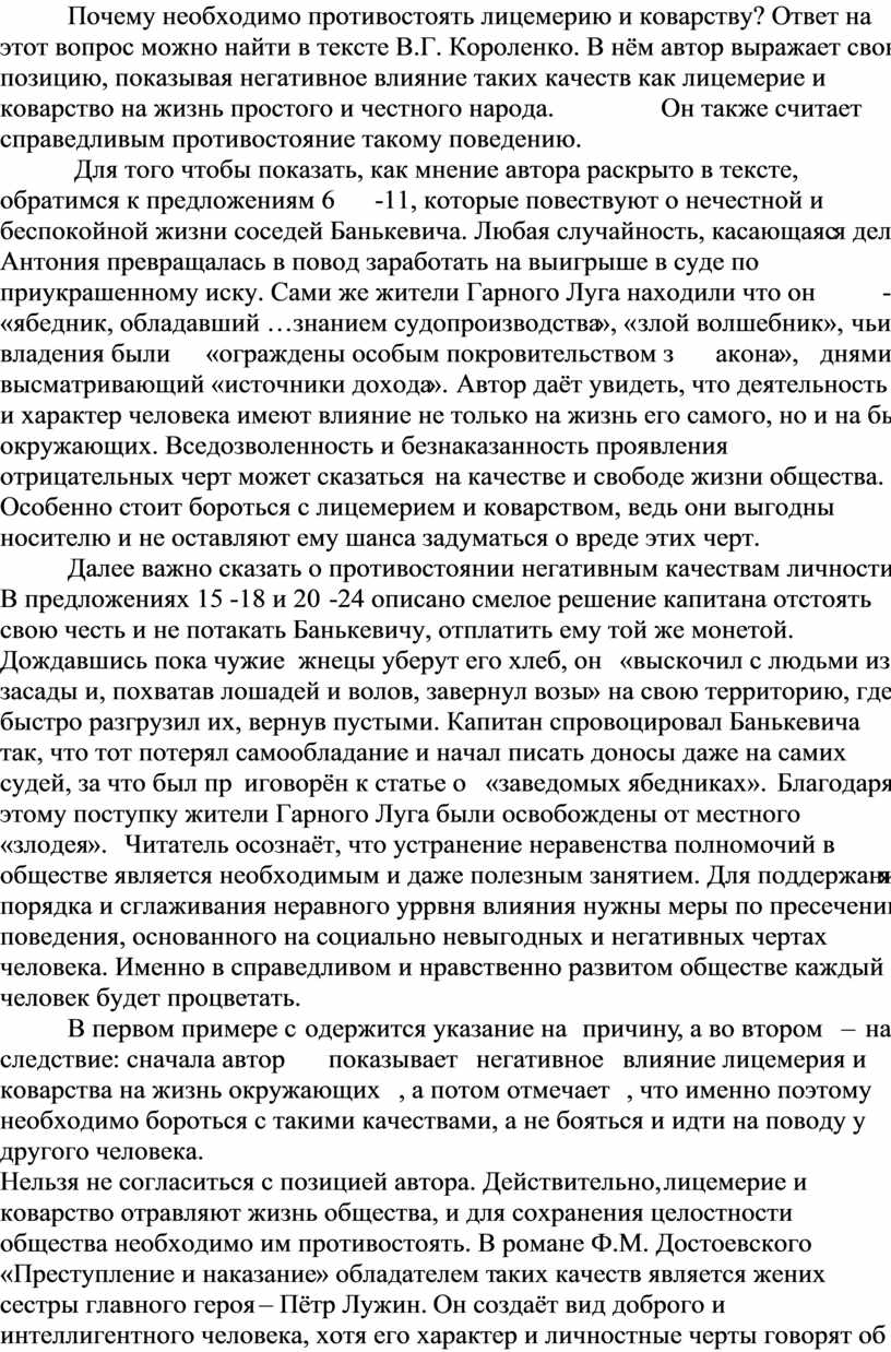 Почему необходимо противостоять лицемерию и коварству? Ответ на этот вопрос можно найти в тексте В.Г. Короленко. В нём автор выражает свою позицию, показывая негативное влияние таких качеств как лицемерие и коварство на жизнь простого и честного народа. Он также считает справедливым противостояние такому поведению.