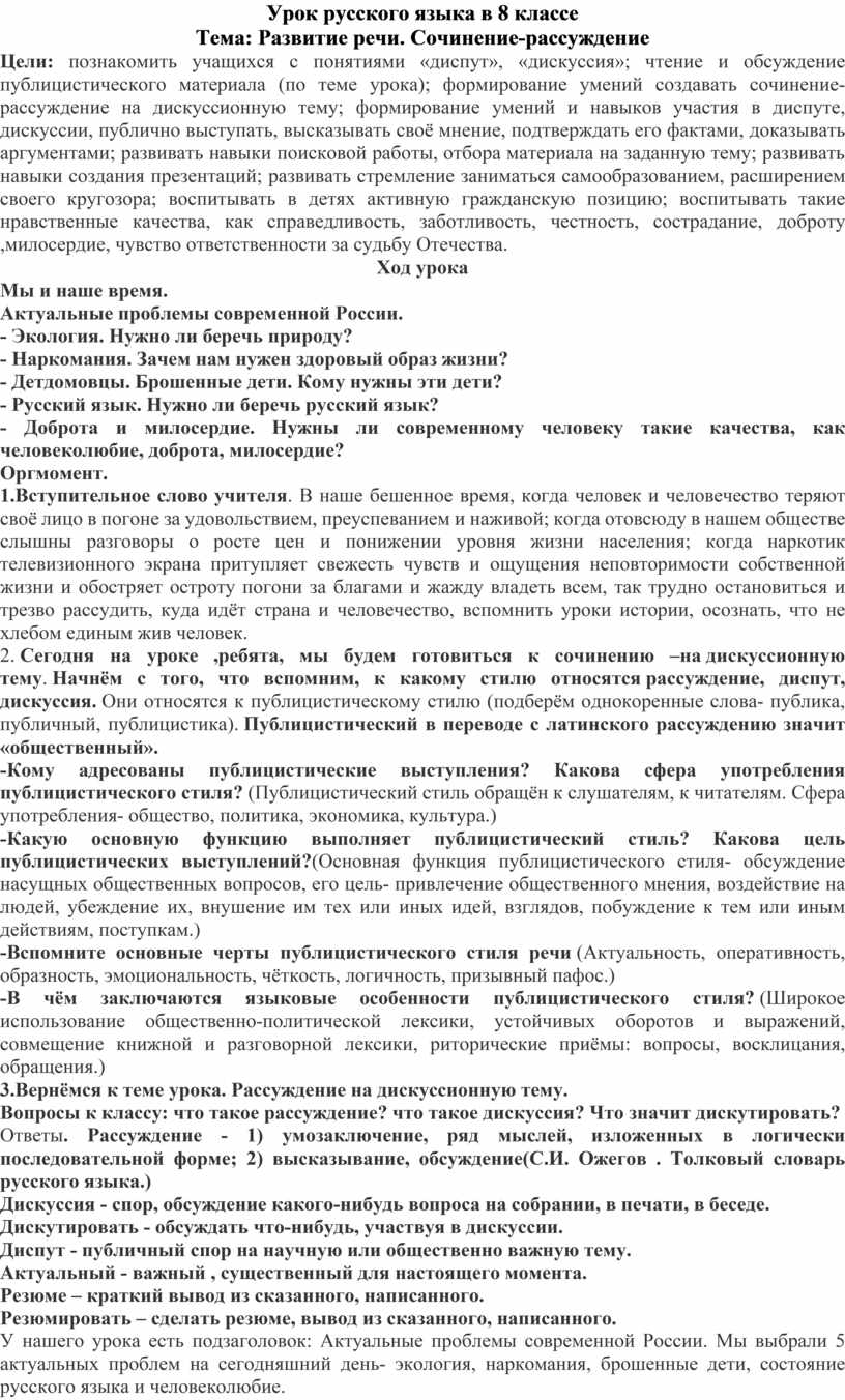 Цели: познакомить учащихся с понятиями «диспут», «дискуссия»; чтение и обсуждение публицистического материала (по теме урока); формирование умений создавать сочинение-рассуждение на дискуссионную тему; формирование умений и навыков участия в диспуте, дискуссии, публично выступать, высказывать своё мнение, подтверждать его фактами, доказывать аргументами; развивать навыки поисковой работы, отбора материала на заданную тему; развивать навыки создания презентаций; развивать стремление заниматься самообразованием, расширением своего кругозора; воспитывать в детях активную гражданскую позицию; воспитывать такие нравственные качества, как справедливость, заботливость, честность, сострадание, доброту ,милосердие, чувство ответственности за судьбу Отечества.