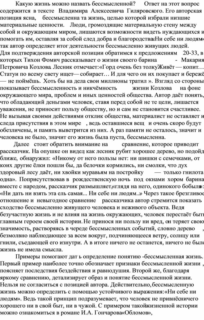 Нельзя не согласиться с позицией автора. Действительно, бессмысленную жизнь можно определить с помощью устойчивого выражения: «Ни себе ни людям». Ведь такой принцип подразумевает, что человек не привнёс ничего хорошего ни в свой быт, ни в чужой. С примером такой жизненной истории можно ознакомиться в романе И.А. Гончарова «Обломов», действия которого разворачиваются вокруг фигуры Ильи Ильича – ленивого и безучастного человека. За всю свою жизнь он так ничего и не сделал, разве что позволил окружающей обстановке меняться под действием внешних факторов. Крах отношений, финансовые проблемы, смерть - череда прошедших сквозь Обломова событий, которым он не дал отпор. Его жизнь была бессмысленна.