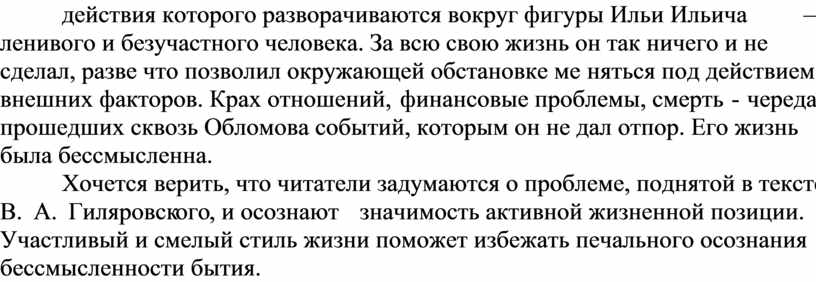 Хочется верить, что читатели задумаются о проблеме, поднятой в тексте В. А. Гиляровского, и осознают значимость активной жизненной позиции. Участливый и смелый стиль жизни поможет избежать печального осознания бессмысленности бытия.