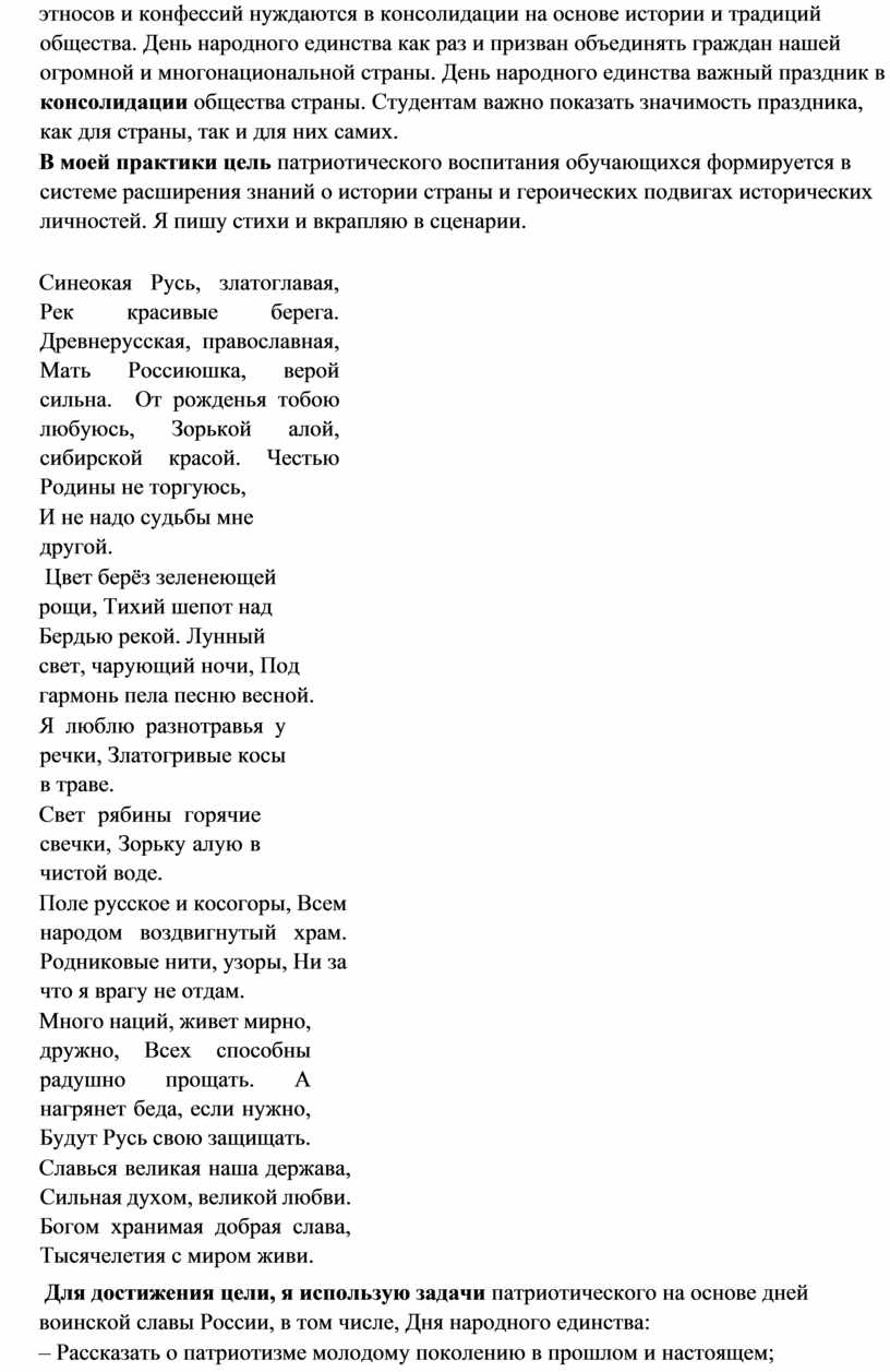 В моей практики цель патриотического воспитания обучающихся формируется в системе расширения знаний о истории страны и героических подвигах исторических личностей. Я пишу стихи и вкрапляю в сценарии.