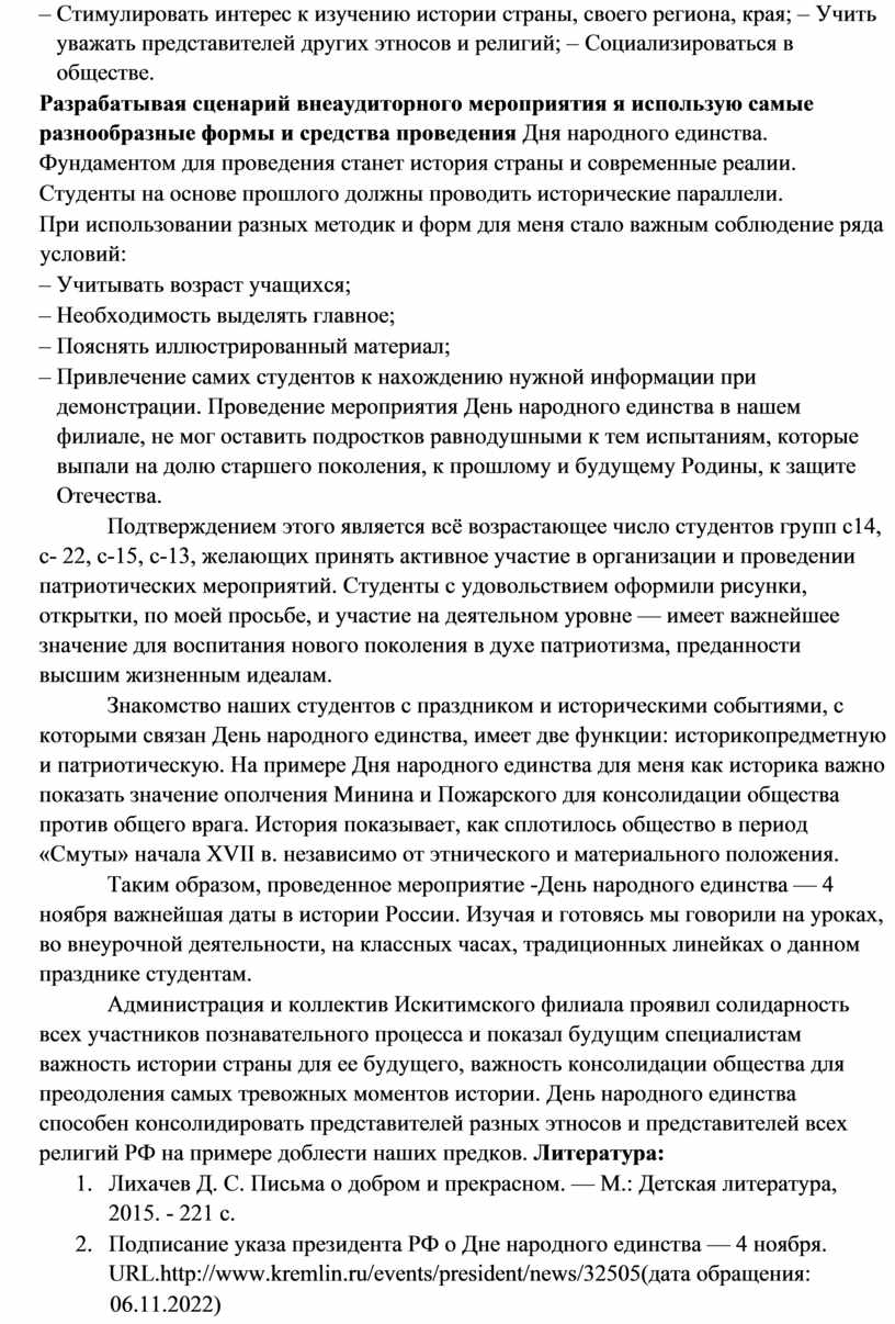 Таким образом, проведенное мероприятие -День народного единства — 4 ноября важнейшая даты в истории России. Изучая и готовясь мы говорили на уроках, во внеурочной деятельности, на классных часах, традиционных линейках о данном празднике студентам.