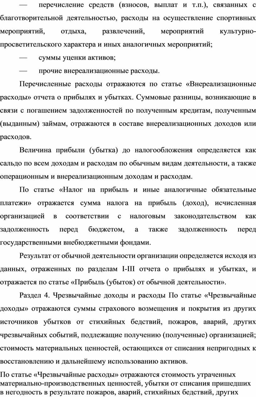 Раздел 4. Чрезвычайные доходы и расходы По статье «Чрезвычайные доходы» отражаются суммы страхового возмещения и покрытия из других источников убытков от стихийных бедствий, пожаров, аварий, других чрезвычайных событий, подлежащие получению (полученные) организацией; стоимость материальных ценностей, остающихся от списания непригодных к восстановлению и дальнейшему использованию активов.