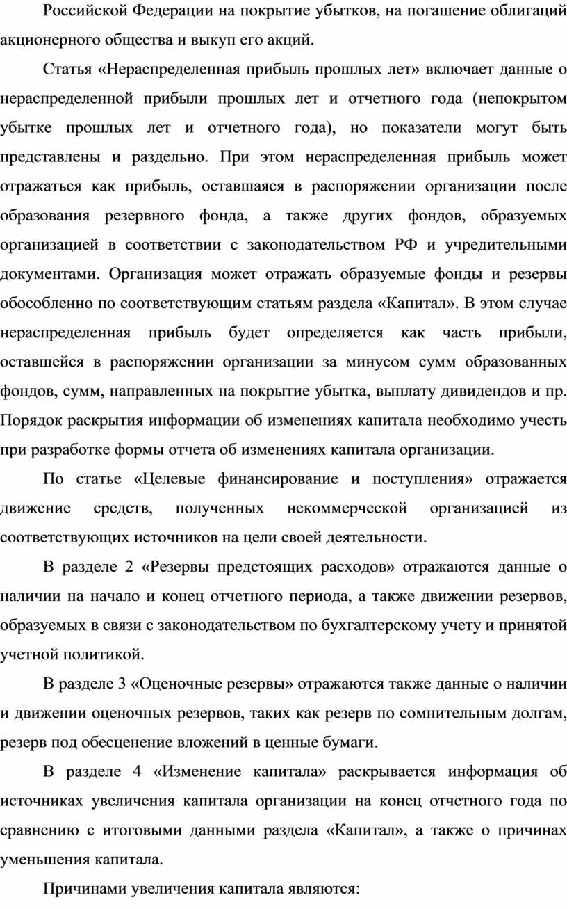 Статья «Нераспределенная прибыль прошлых лет» включает данные о нераспределенной прибыли прошлых лет и отчетного года (непокрытом убытке прошлых лет и отчетного года), но показатели могут быть представлены и раздельно. При этом нераспределенная прибыль может отражаться как прибыль, оставшаяся в распоряжении организации после образования резервного фонда, а также других фондов, образуемых организацией в соответствии с законодательством РФ и учредительными документами. Организация может отражать образуемые фонды и резервы обособленно по соответствующим статьям раздела «Капитал». В этом случае нераспределенная прибыль будет определяется как часть прибыли, оставшейся в распоряжении организации за минусом сумм образованных фондов, сумм, направленных на покрытие убытка, выплату дивидендов и пр. Порядок раскрытия информации об изменениях капитала необходимо учесть при разработке формы отчета об изменениях капитала организации.