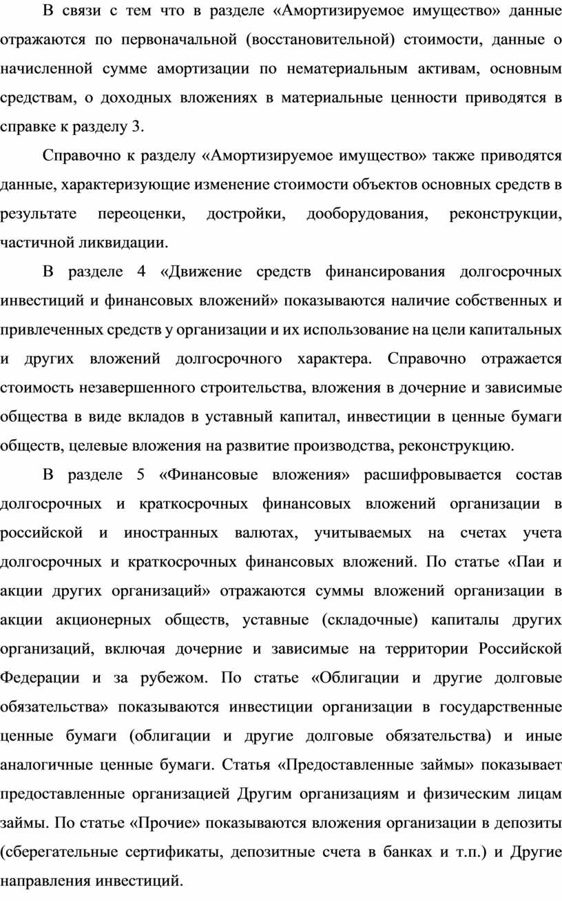 В связи с тем что в разделе «Амортизируемое имущество» данные отражаются по первоначальной (восстановительной) стоимости, данные о начисленной сумме амортизации по нематериальным активам, основным средствам, о доходных вложениях в материальные ценности приводятся в справке к разделу 3.