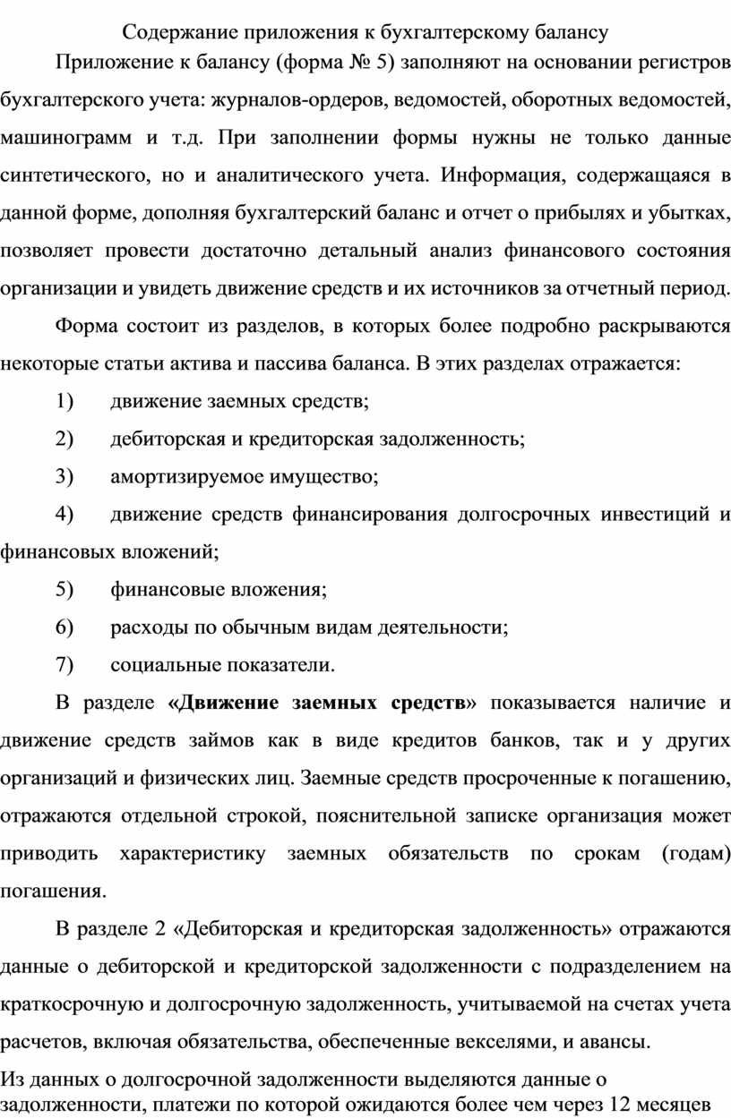 Приложение к балансу (форма № 5) заполняют на основании регистров бухгалтерского учета: журналов-ордеров, ведомостей, оборотных ведомостей, машинограмм и т.д. При заполнении формы нужны не только данные синтетического, но и аналитического учета. Информация, содержащаяся в данной форме, дополняя бухгалтерский баланс и отчет о прибылях и убытках, позволяет провести достаточно детальный анализ финансового состояния организации и увидеть движение средств и их источников за отчетный период.