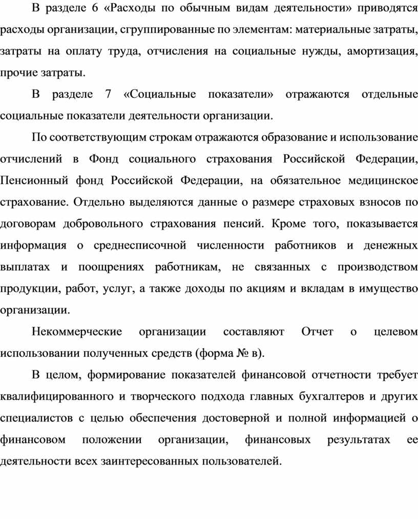В разделе 6 «Расходы по обычным видам деятельности» приводятся расходы организации, сгруппированные по элементам: материальные затраты, затраты на оплату труда, отчисления на социальные нужды, амортизация, прочие затраты.