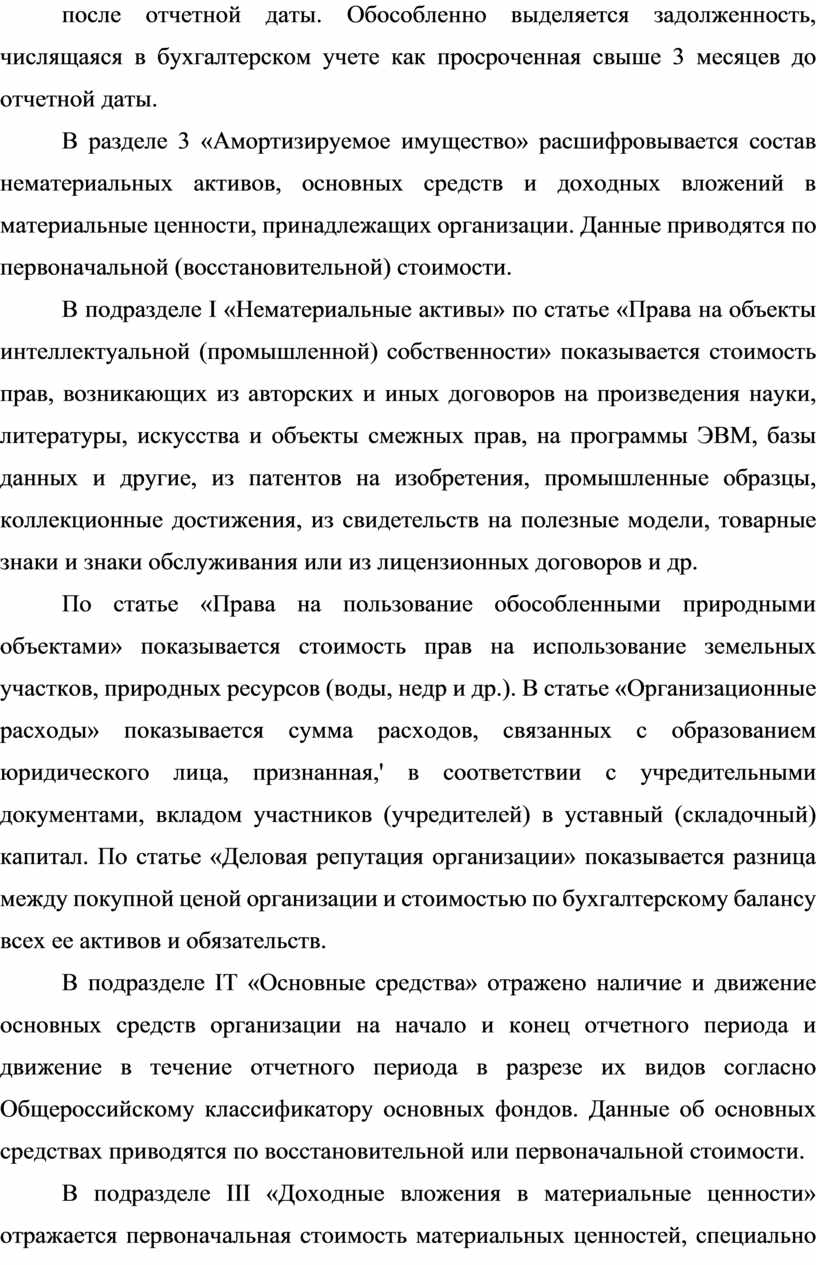 В разделе 3 «Амортизируемое имущество» расшифровывается состав нематериальных активов, основных средств и доходных вложений в материальные ценности, принадлежащих организации. Данные приводятся по первоначальной (восстановительной) стоимости.