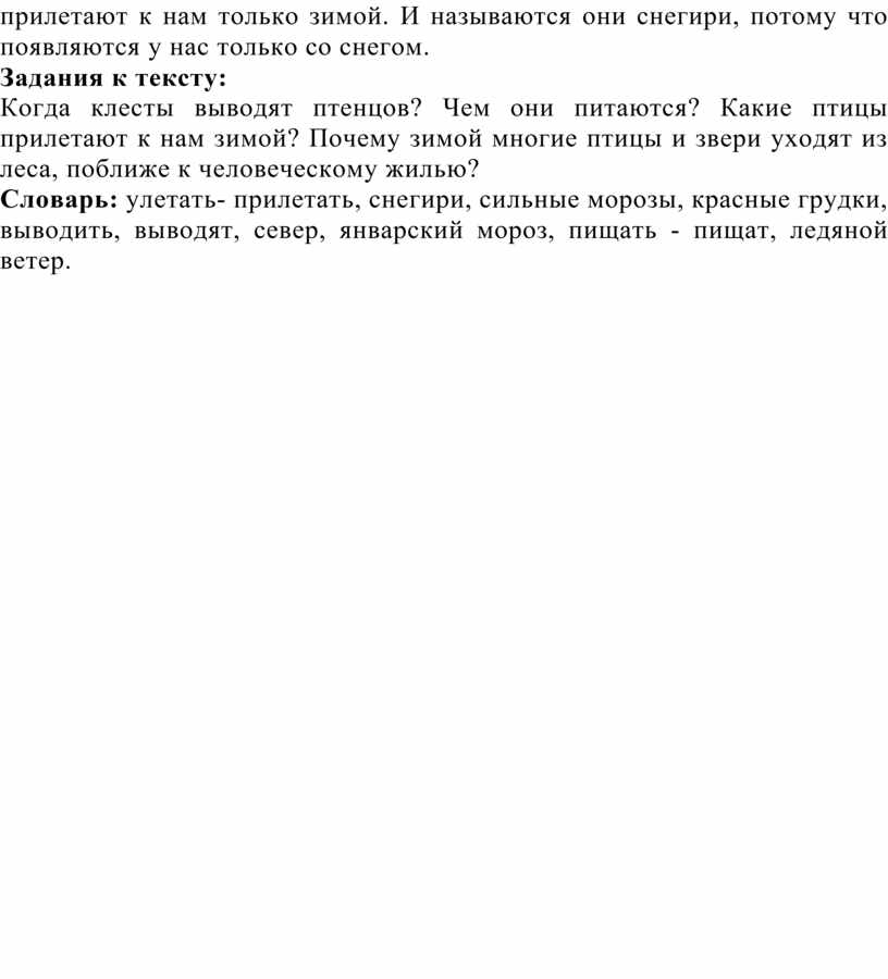 Словарь: улетать- прилетать, снегири, сильные морозы, красные грудки, выводить, выводят, север, январский мороз, пищать - пищат, ледяной ветер.