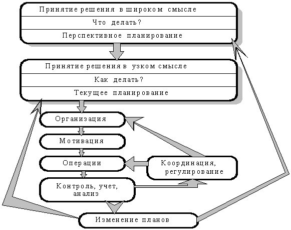 Как правило, процессы управления фирмой очень многообразны (см. раздел 3), многомерны и имеют сложную структуру (состоят из большого числа стадий и фаз). В общем смысле процесс управления состоит из общих функций управления, которые объединяются в циклы управления (рис.23).