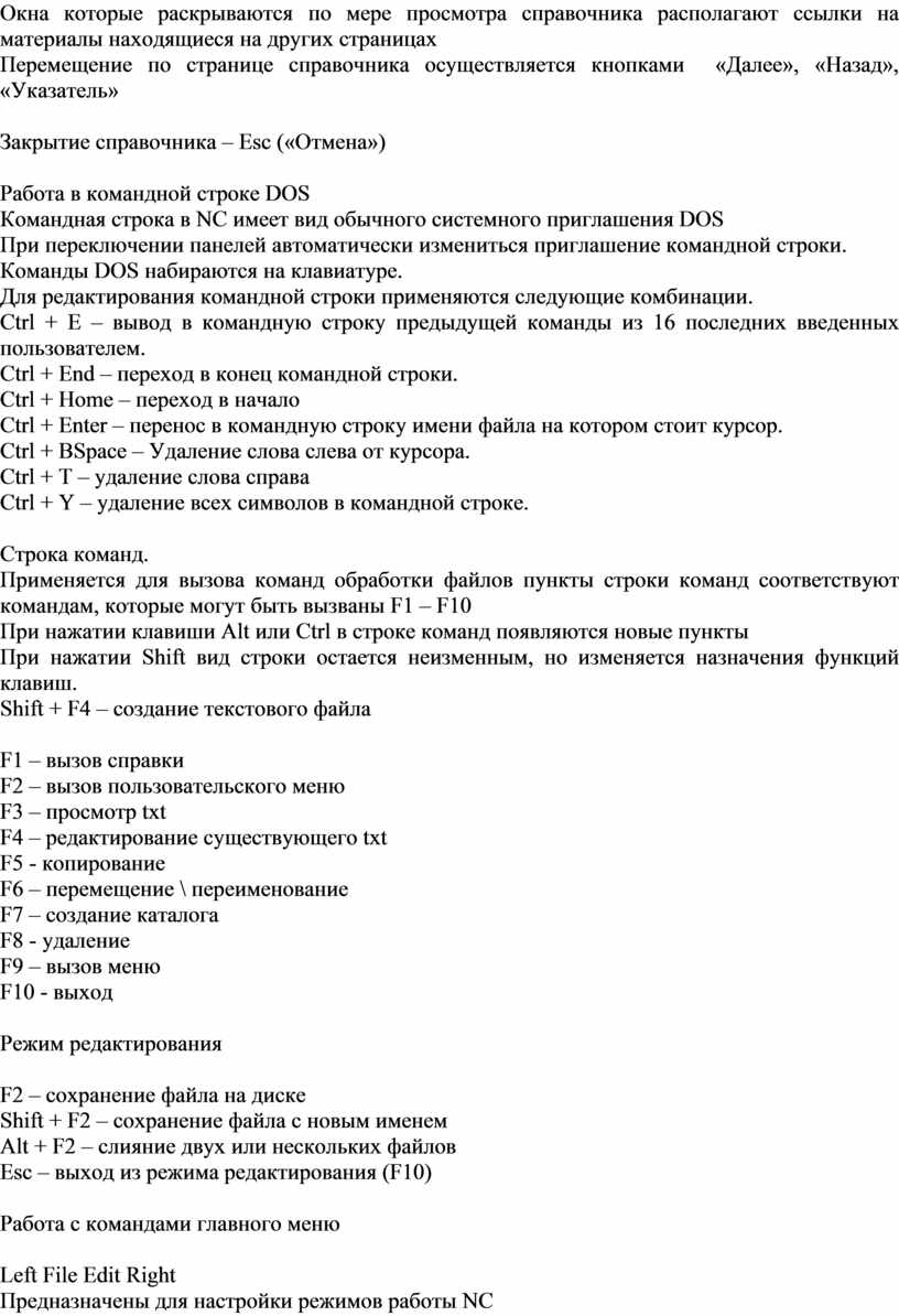 На экран выводиться контекстно-зависимая подсказка для разъяснения пользования теми или иными средствами Norton Commander
