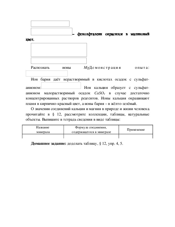 Э л е м е н т ы с о д е р ж а н и я : соединения щелочноземельных