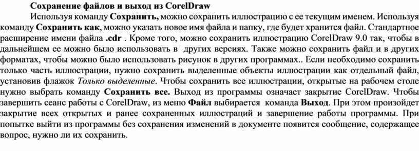 Используя команду Сохранить, можно сохранить иллюстрацию с ее текущим именем. Используя команду Сохранить как, можно указать новое имя файла и папку, где будет хранится файл. Стандартное расширение имени файла .cdr . Кроме того, можно сохранить иллюстрацию CorelDraw 9.0 так, чтобы в дальнейшем ее можно было использовать в других версиях. Также можно сохранить файл и в других форматах, чтобы можно было использовать рисунок в других программах.. Если необходимо сохранить только часть иллюстрации, нужно сохранить выделенные объекты иллюстрации как отдельный файл, установив флажок Только выделенные. Чтобы сохранить все иллюстрации, открытые на рабочем столе нужно выбрать команду Сохранить все. Выход из программы означает закрытие CorelDraw. Чтобы завершить сеанс работы с CorelDraw, из меню Файл выбирается команда Выход. При этом произойдет закрытие всех открытых и ранее сохраненных иллюстраций и завершение работы программы. При попытке выйти из программы без сохранения изменений в документе появится сообщение, содержащее вопрос, нужно ли их сохранить.