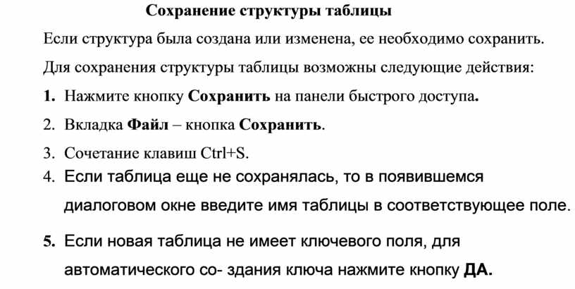 Если структура была создана или изменена, ее необходимо сохранить. Для сохранения структуры таблицы возможны следующие действия: