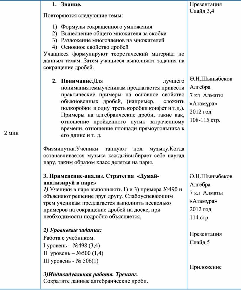 3. Применение-анализ. Стратегия «Думай-анализируй в паре» 1) Ученики в паре выполняють 1) и 3) примера №490 и объясняют решение друг другу. Слабоуспевающим трем ученикам предлагается выполнить несколько примеров на сокращение дробей на доске, при необходимости подробно объясняется.