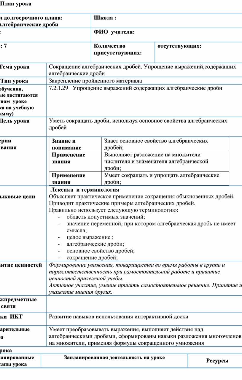 Раздел долгосрочного плана: 7.4С Алгебраические дроби |