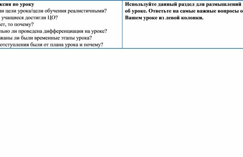Используйте данный раздел для размышлений об уроке. Ответьте на самые важные вопросы о Вашем уроке из левой колонки. |