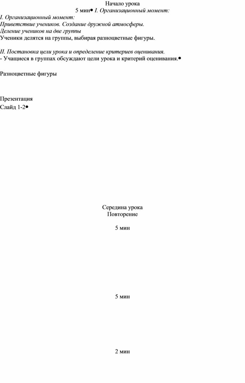 І. Организационный момент: Приветствие учеников. Создание дружной атмосферы. Деление учеников на две группы Ученики делятся на группы, выбирая разноцветные фигуры.