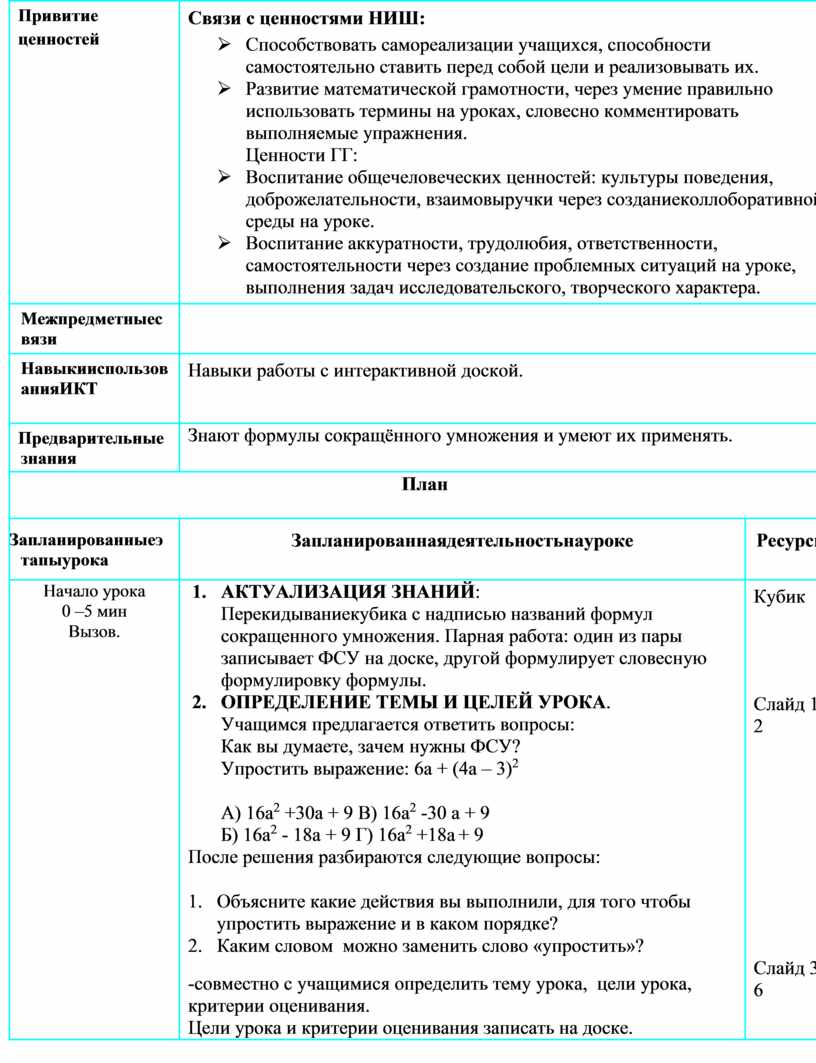 Связи с ценностями НИШ: Ø Способствовать самореализации учащихся, способности самостоятельно ставить перед собой цели и реализовывать их. Ø Развитие математической грамотности, через умение правильно использовать термины на уроках, словесно комментировать выполняемые упражнения. Ценности ГГ: Ø Воспитание общечеловеческих ценностей: культуры поведения, доброжелательности, взаимовыручки через созданиеколлоборативной среды на уроке. Ø Воспитание аккуратности, трудолюбия, ответственности, самостоятельности через создание проблемных ситуаций на уроке, выполнения задач исследовательского, творческого характера. |