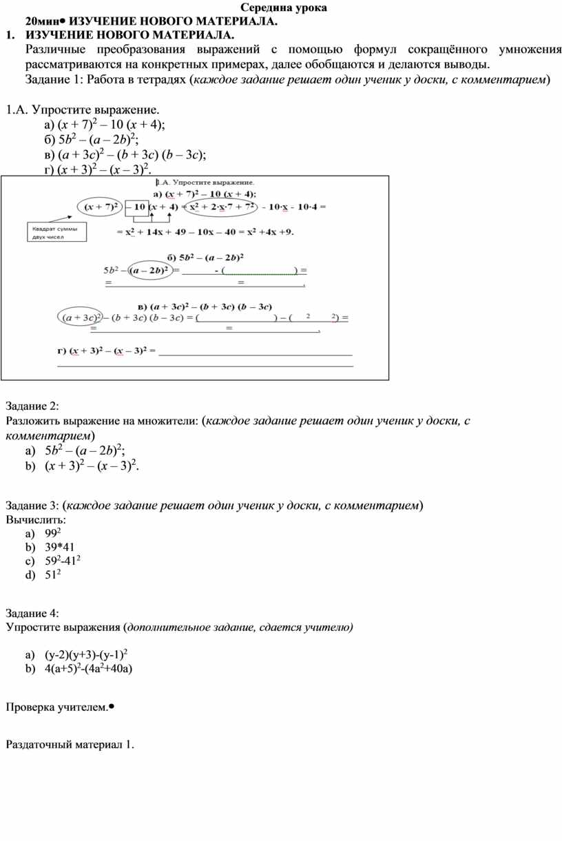 3. ИЗУЧЕНИЕ НОВОГО МАТЕРИАЛА. Различные преобразования выражений с помощью формул сокращённого умножения рассматриваются на конкретных примерах, далее обобщаются и делаются выводы. Задание 1: Работа в тетрадях (каждое задание решает один ученик у доски, с комментарием) 1.А. Упростите выражение. а) (x + 7)2 – 10 (x + 4); б) 5b2 – (a – 2b)2; в) (a + 3c)2 – (b + 3c) (b – 3c); г) (x + 3)2 – (x – 3)2.