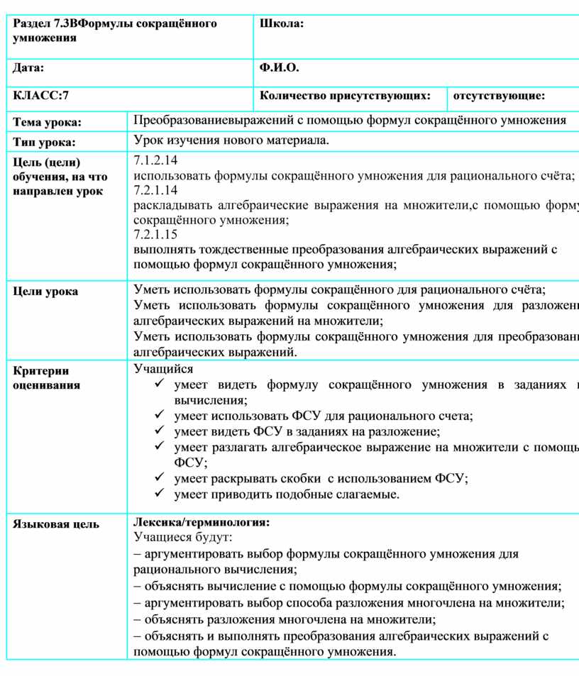 Лексика/терминология: Учащиеся будут: - аргументировать выбор формулы сокращённого умножения для рационального вычисления; - объяснять вычисление с помощью формулы сокращённого умножения; - аргументировать выбор способа разложения многочлена на множители; - объяснять разложения многочлена на множители; - объяснять и выполнять преобразования алгебраических выражений с помощью формул сокращённого умножения. |