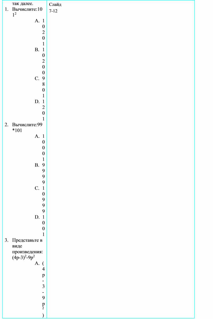 Учащимся раздаётся тест. Время на выполнение теста 7 мин. По окончанию работы учитель проводит проверку теста с помощью интерактивной доски в интерактивном режиме, то есть учитель спрашивает какой ответ получился в первом задании у учащихся, после ответа ученика высвечивает верный ответ. Затем спрашивает: «У кого такой же ответ поднимите руку?». По мере необходимости проводится корректировка решения. И так далее. 1. Вычислите:1012 A. 10201 B. 10200 C. 9801 D. 1201 2. Вычислите:99*101 A. 10001 B. 9999 C. 10999 D. 1001 3. Представьте в виде произведения: (4p-3)2-9p2 A. (4p-3-9p2)(4p-3+9p2) B. (3-p)(7p-3) C. (p-3)(7p-3) D. (-5p-3)(5p-3) 4. Преобразуйте выражение: (3х – 2)(3х + 2) – (1 + х)(х – 1) A. 8х2 – 3 B. 8х2 + 3 C. 9х2 – 3 D. 8х2 – 5 5. Решите уравнение: (х – 5)2 = 5х2 – (2х – 1)(2х + 1) A. B. C. -2,4 D. Самопроверка. Ответы: 1)А; 2)В; 3)С; 4)А; 5)В |