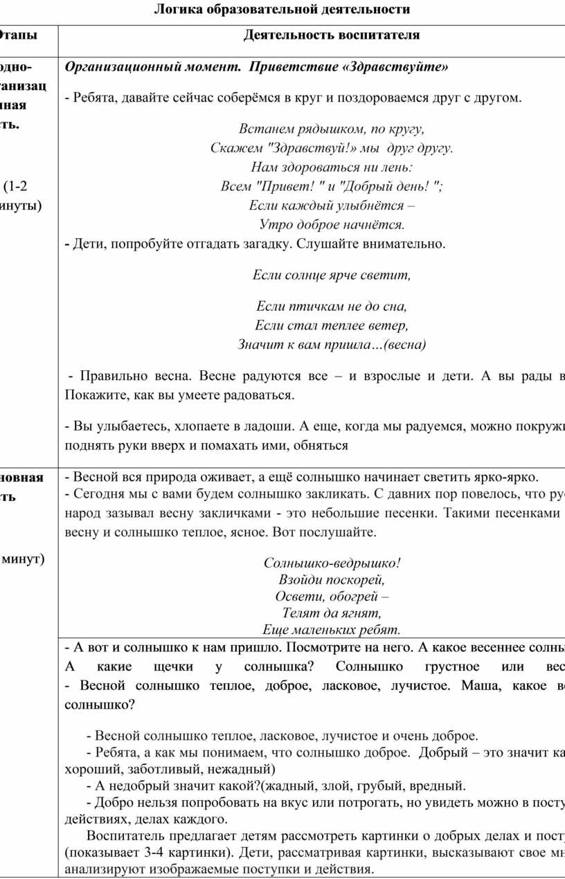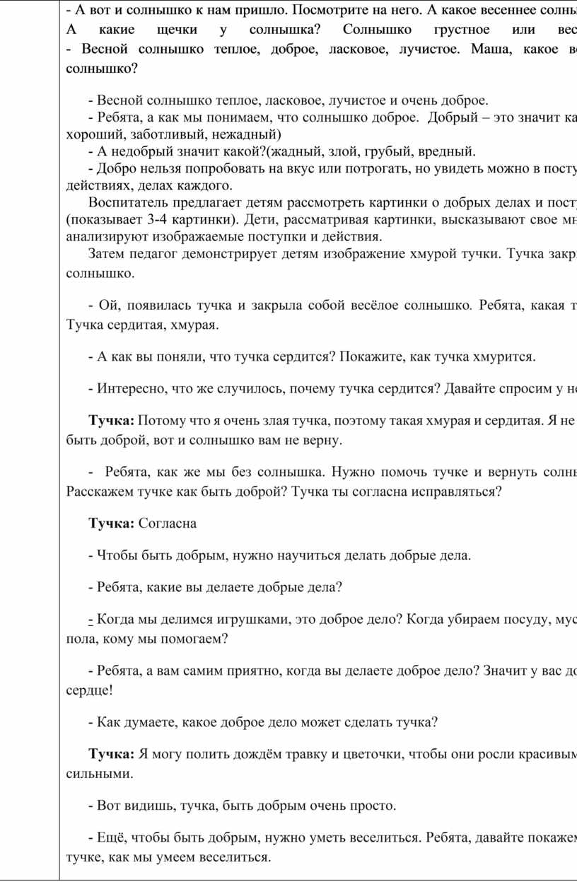 А какие щечки у солнышка? Солнышко грустное или веселое? - Весной солнышко теплое, ласковое, лучистое и очень доброе. - Ребята, а как мы понимаем, что солнышко доброе. Добрый – это значит какой?( хороший, заботливый, нежадный) - А недобрый значит какой?(жадный, злой, грубый, вредный. - Добро нельзя попробовать на вкус или потрогать, но увидеть можно в поступках, действиях, делах каждого. Воспитатель предлагает детям рассмотреть картинки о добрых делах и поступках (показывает 3-4 картинки). Дети, рассматривая картинки, высказывают свое мнение, анализируют изображаемые поступки и действия. Затем педагог демонстрирует детям изображение хмурой тучки. Тучка закрывает солнышко. - Ой, появилась тучка и закрыла собой весёлое солнышко. Ребята, какая тучка? Тучка сердитая, хмурая. - А как вы поняли, что тучка сердится? Покажите, как тучка хмурится. - Интересно, что же случилось, почему тучка сердится? Давайте спросим у неё. Тучка: Потому что я очень злая тучка, поэтому такая хмурая и сердитая. Я не умею быть доброй, вот и солнышко вам не верну. - Ребята, как же мы без солнышка. Нужно помочь тучке и вернуть солнышко. Расскажем тучке как быть доброй? Тучка ты согласна исправляться? Тучка: Согласна - Чтобы быть добрым, нужно научиться делать добрые дела. - Ребята, какие вы делаете добрые дела? - Когда мы делимся игрушками, это доброе дело? Когда убираем посуду, мусор с пола, кому мы помогаем? - Ребята, а вам самим приятно, когда вы делаете доброе дело? Значит у вас доброе сердце! - Как думаете, какое доброе дело может сделать тучка? Тучка: Я могу полить дождём травку и цветочки, чтобы они росли красивыми и сильными. - Вот видишь, тучка, быть добрым очень просто. - Ещё, чтобы быть добрым, нужно уметь веселиться. Ребята, давайте покажем тучке, как мы умеем веселиться. Физкультминутка «Если любишь всех вокруг…» Если любишь всех вокруг, Делай так! (хлопки в ладоши) Если рядом с тобой друг, Делай так! (прыжки на месте) Если дождик вдруг польется, Делай так! (хлопки над головой) Если мама улыбнется, Делай так! (хлопки и прыжки одновременно) Воспитатель предлагает детям сесть за столы