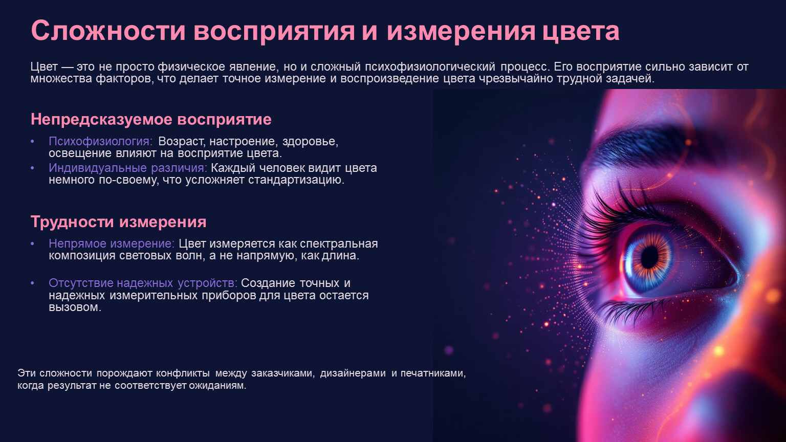 Цвет — это не просто физическое явление, но и сложный психофизиологический процесс. Его восприятие сильно зависит от множества факторов, что делает точное измерение и воспроизведение цвета чрезвычайно трудной задачей.