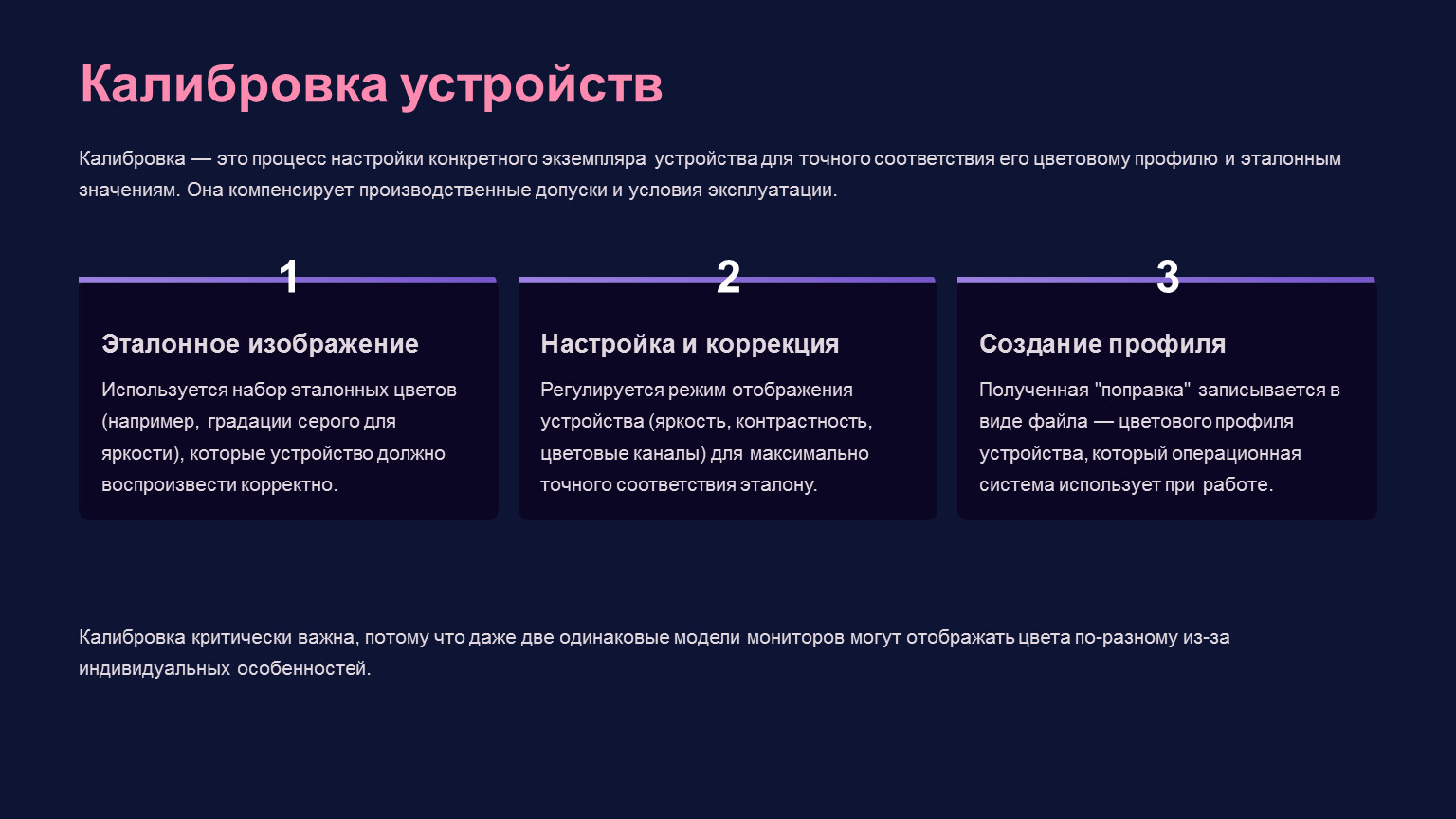 Калибровка — это процесс настройки конкретного экземпляра устройства для точного соответствия его цветовому профилю и эталонным значениям. Она компенсирует производственные допуски и условия эксплуатации.
