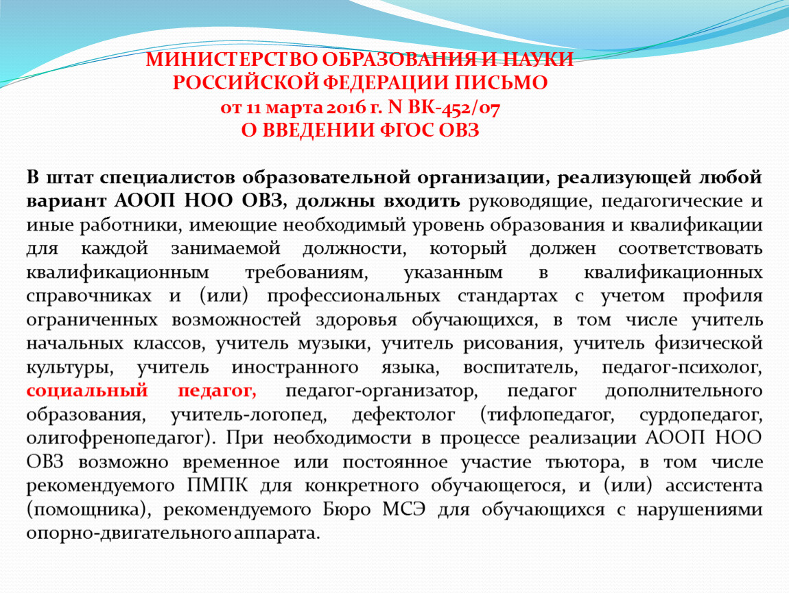 В штат специалистов образовательной организации, реализующей любой вариант АООП НОО ОВЗ, должны входить руководящие, педагогические и иные работники, имеющие необходимый уровень образования и квалификации для каждой занимаемой должности, который должен соответствовать квалификационным требованиям, указанным в квалификационных справочниках и (или) профессиональных стандартах с учетом профиля ограниченных возможностей здоровья обучающихся, в том числе учитель начальных классов, учитель музыки, учитель рисования, учитель физической культуры, учитель иностранного языка, воспитатель, педагог-психолог, социальный педагог, педагог-организатор, педагог дополнительного образования, учитель-логопед, дефектолог (тифлопедагог, сурдопедагог, олигофренопедагог). При необходимости в процессе реализации АООП НОО ОВЗ возможно временное или постоянное участие тьютора, в том числе рекомендуемого ПМПК для конкретного обучающегося, и (или) ассистента (помощника), рекомендуемого Бюро МСЭ для обучающихся с нарушениями опорно-двигательного аппарата.