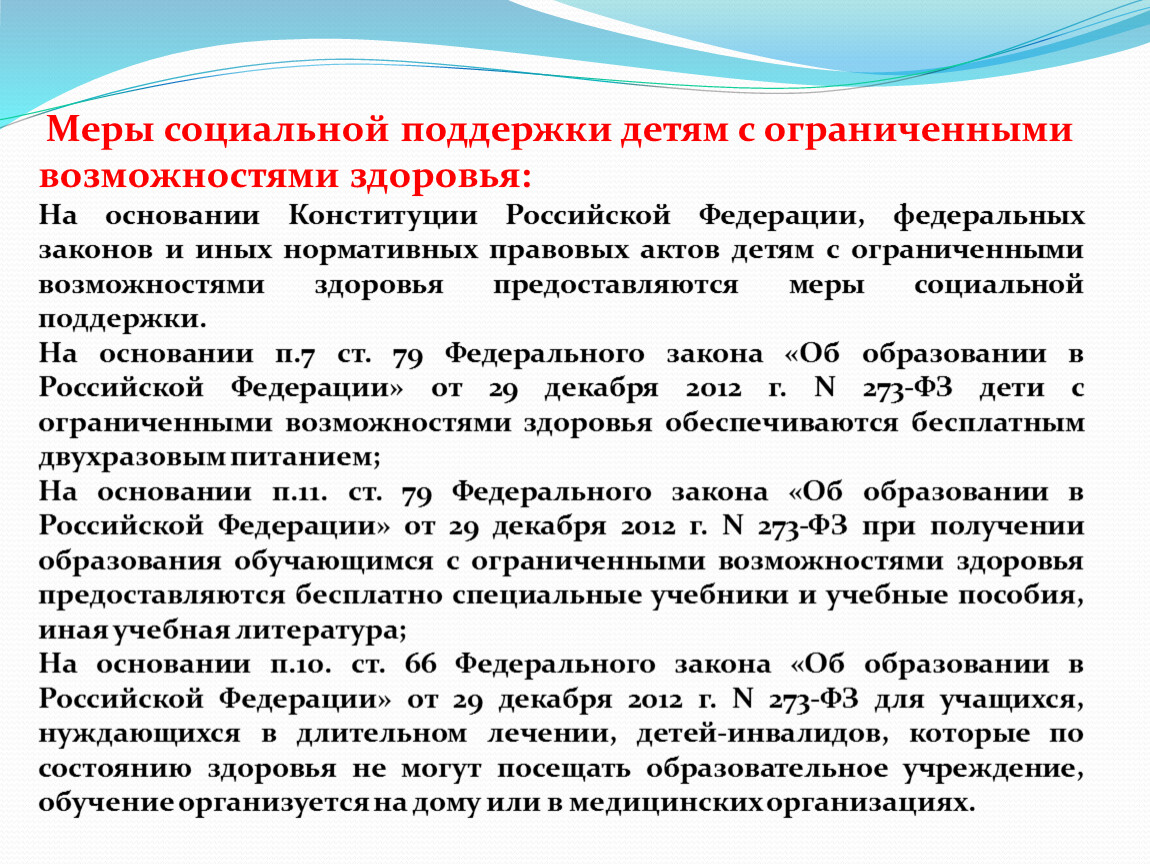 На основании Конституции Российской Федерации, федеральных законов и иных нормативных правовых актов детям с ограниченными возможностями здоровья предоставляются меры социальной поддержки.