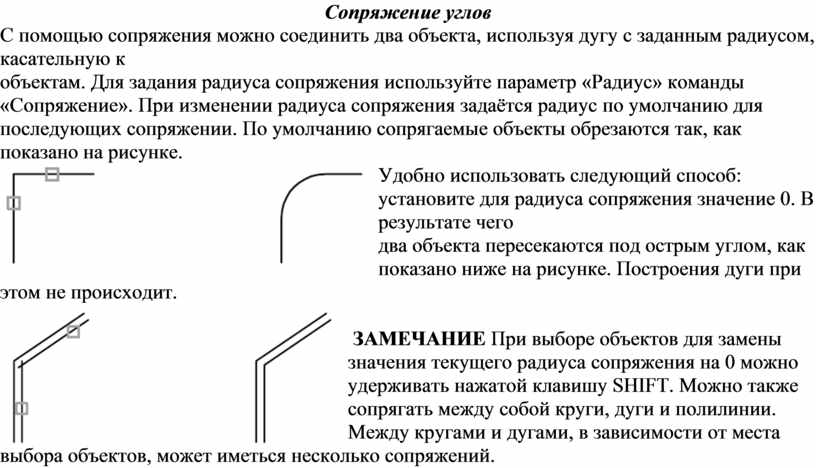 объектам. Для задания радиуса сопряжения используйте параметр «Радиус» команды «Сопряжение». При изменении радиуса сопряжения задаётся радиус по умолчанию для последующих сопряжении. По умолчанию сопрягаемые объекты обрезаются так, как показано на рисунке.