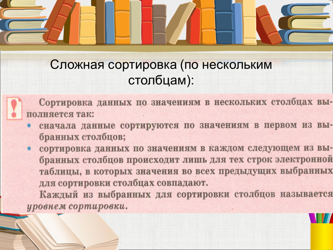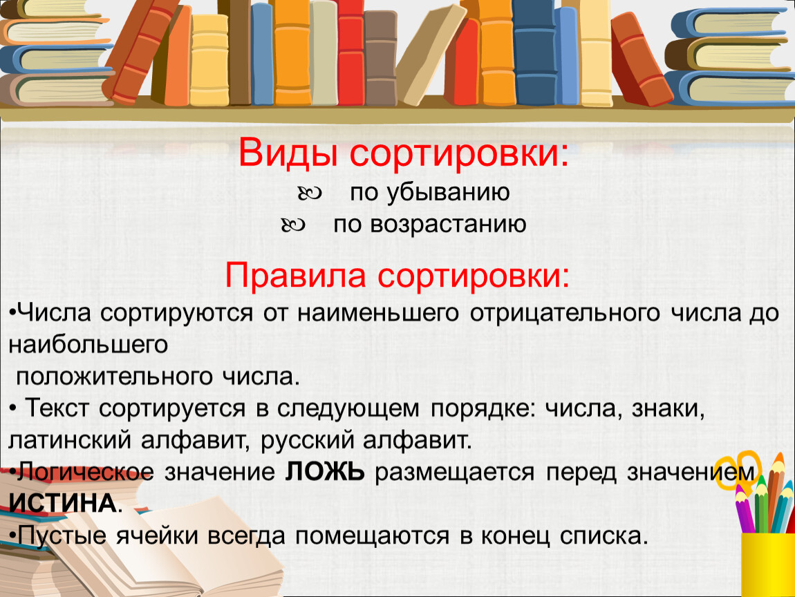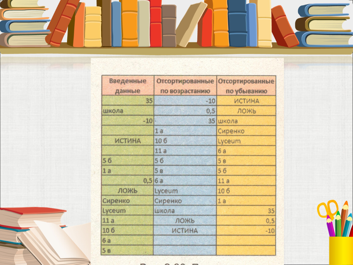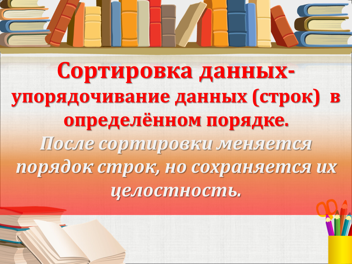 Сортировка данных- упорядочивание данных (строк) в определённом порядке. После сортировки меняется порядок строк, но сохраняется их целостность.