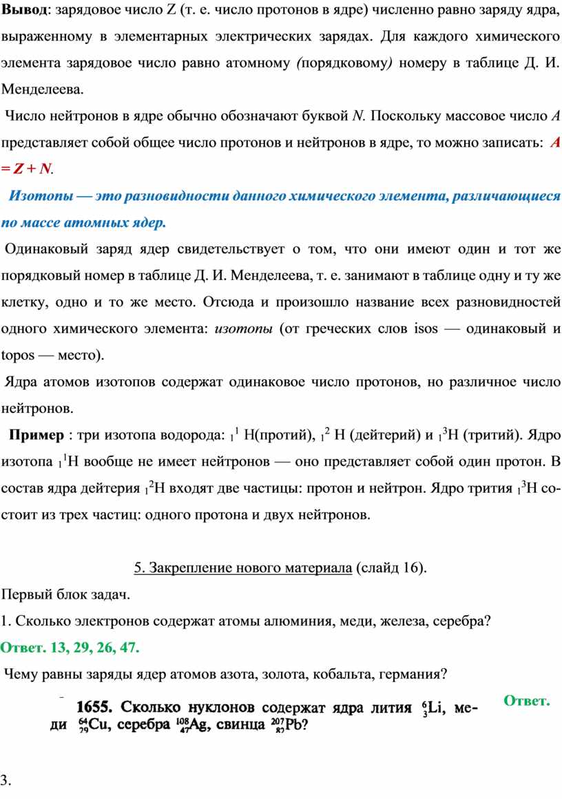 Вывод: зарядовое число Z (т. е. число протонов в ядре) численно равно заряду ядра, выраженному в элементарных электрических зарядах. Для каждого химического элемента зарядовое число равно атомному (порядковому) номеру в таблице Д. И. Менделеева.