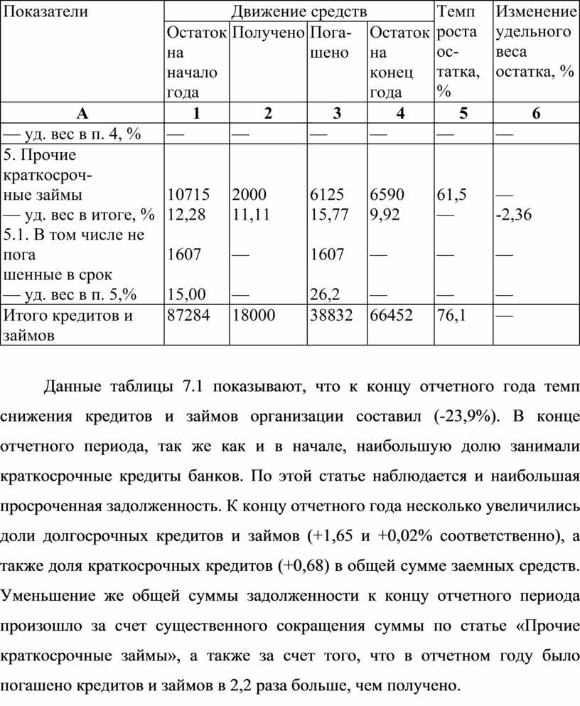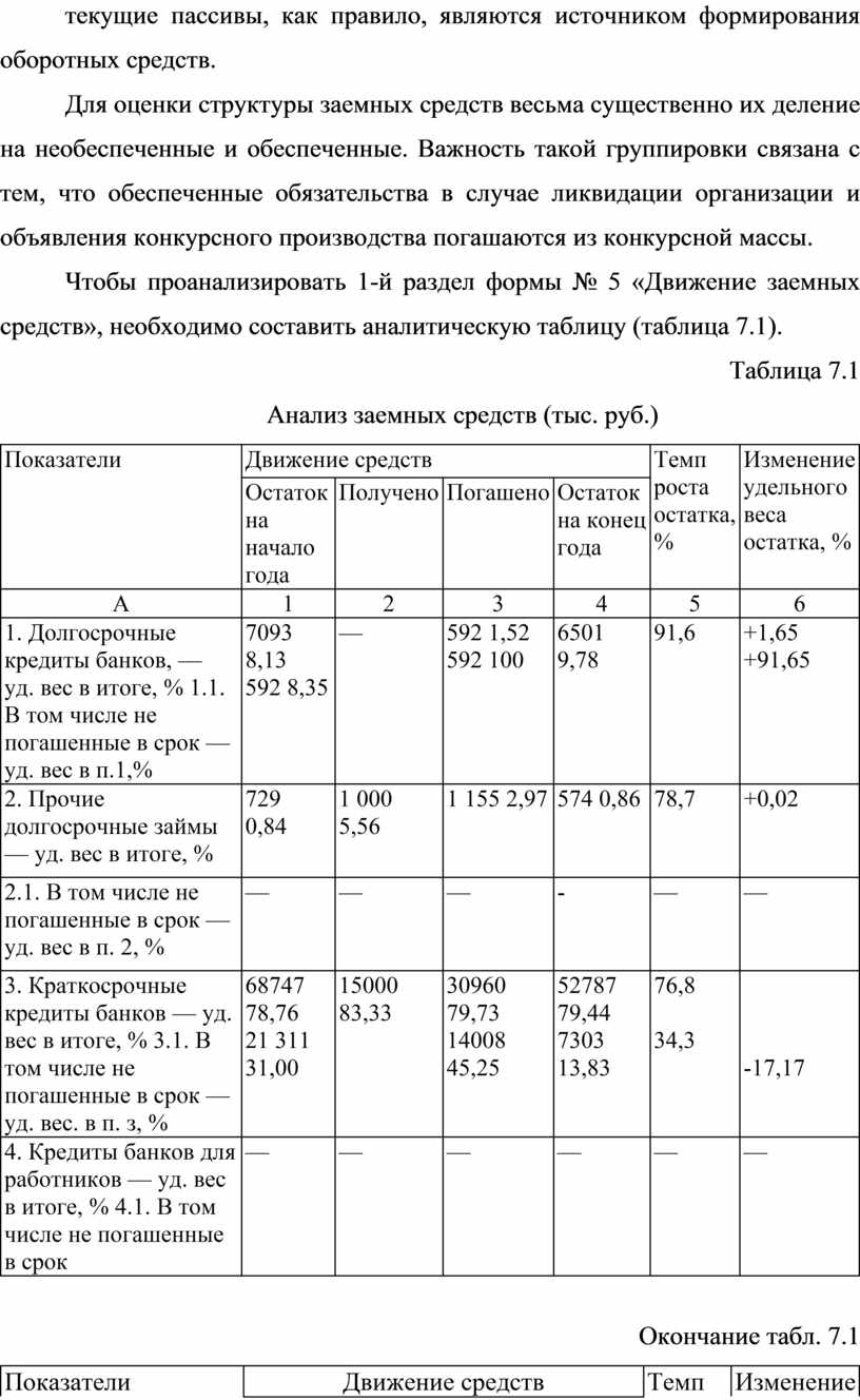Чтобы проанализировать 1-й раздел формы № 5 «Движение заемных средств», необходимо составить аналитическую таблицу (таблица 7.1).