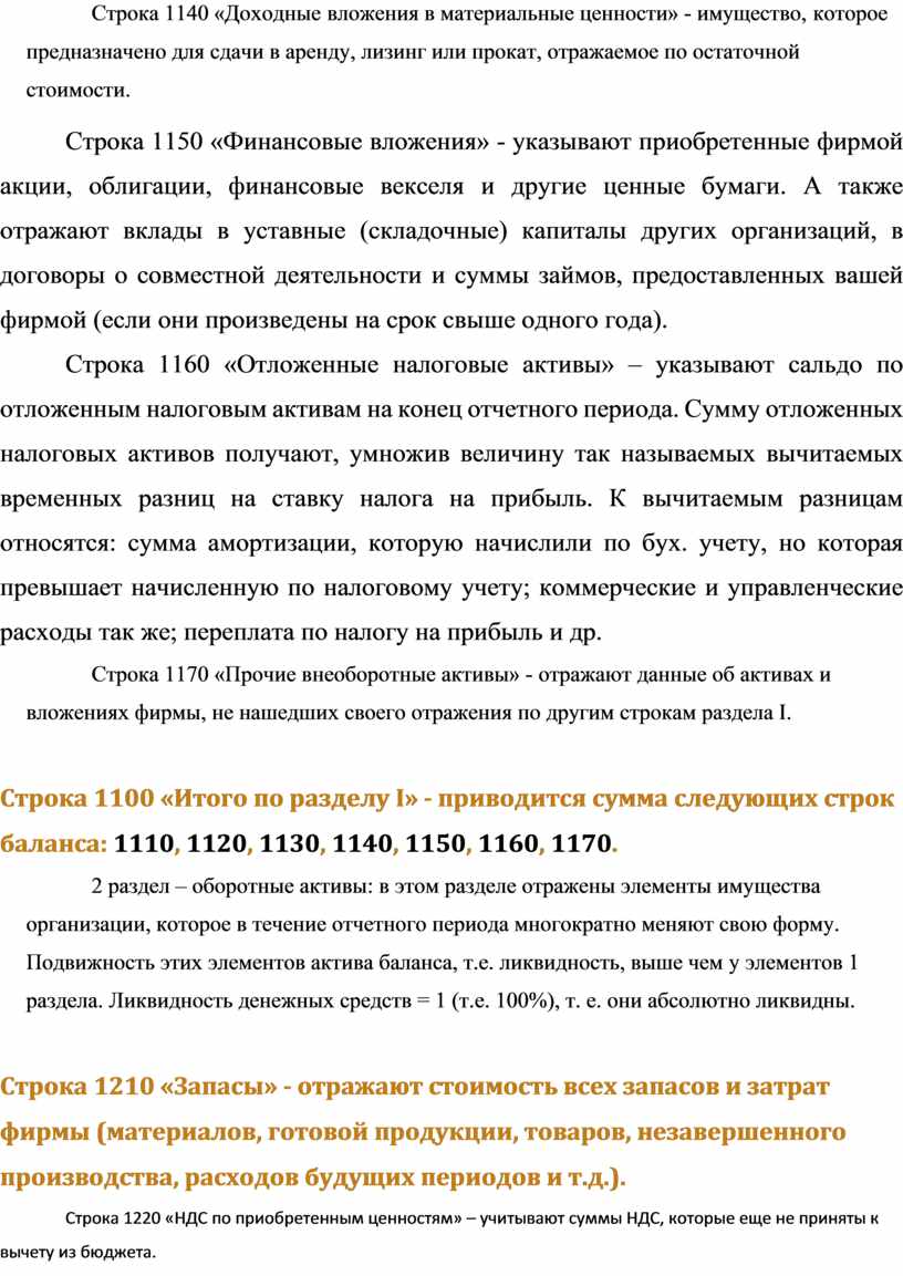 Строка 1170 «Прочие внеоборотные активы» - отражают данные об активах и вложениях фирмы, не нашедших своего отражения по другим строкам раздела I.