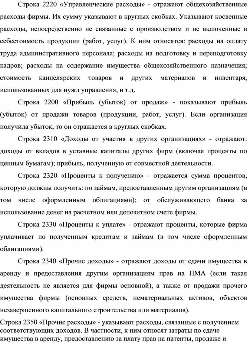 Строка 2220 «Управленческие расходы» - отражают общехозяйственные расходы фирмы. Их сумму указывают в круглых скобках. Указывают косвенные расходы, непосредственно не связанные с производством и не включенные в себестоимость продукции (работ, услуг). К ним относятся: расходы на оплату труда административного персонала; расходы на подготовку и переподготовку кадров; расходы на содержание имущества общехозяйственного назначения; стоимость канцелярских товаров и других материалов и инвентаря, использованных для нужд управления, и т.д.