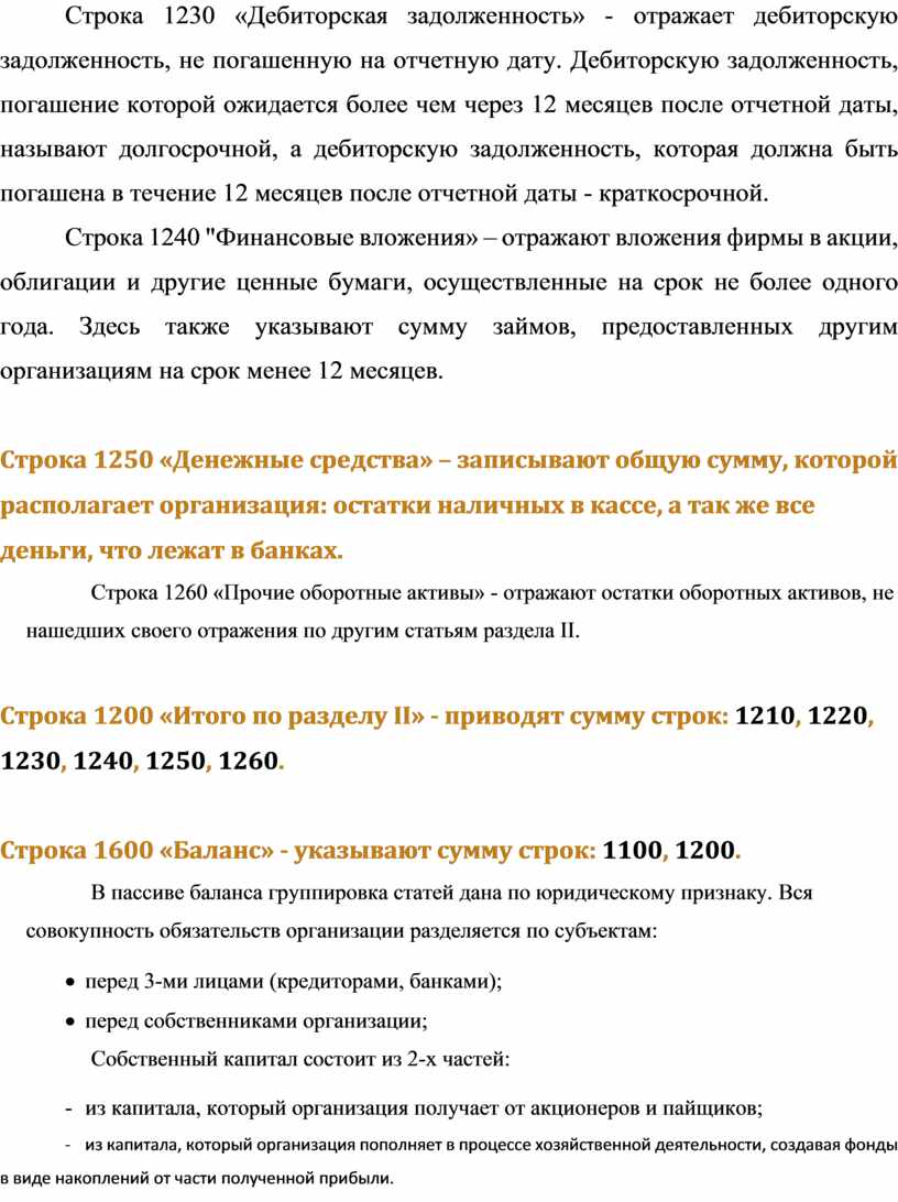 Строка 1230 «Дебиторская задолженность» - отражает дебиторскую задолженность, не погашенную на отчетную дату. Дебиторскую задолженность, погашение которой ожидается более чем через 12 месяцев после отчетной даты, называют долгосрочной, а дебиторскую задолженность, которая должна быть погашена в течение 12 месяцев после отчетной даты - краткосрочной.