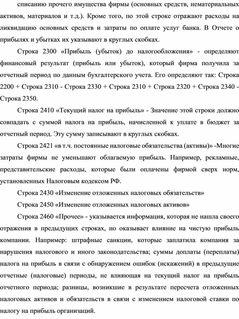 Строка 2350 «Прочие расходы» - указывают расходы, связанные с получением соответствующих доходов. В частности, к ним относят затраты по сдаче имущества в аренду, предоставлению за плату прав на патенты, продаже и списанию прочего имущества фирмы (основных средств, нематериальных активов, материалов и т.д.). Кроме того, по этой строке отражают расходы на ликвидацию основных средств и затраты по оплате услуг банка. В Отчете о прибылях и убытках их указывают в круглых скобках.