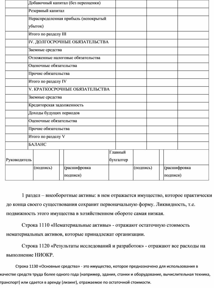 1 раздел – внеоборотные активы: в нем отражается имущество, которое практически до конца своего существования сохранит первоначальную форму. Ликвидность, т.е. подвижность этого имущества в хозяйственном обороте самая низкая.