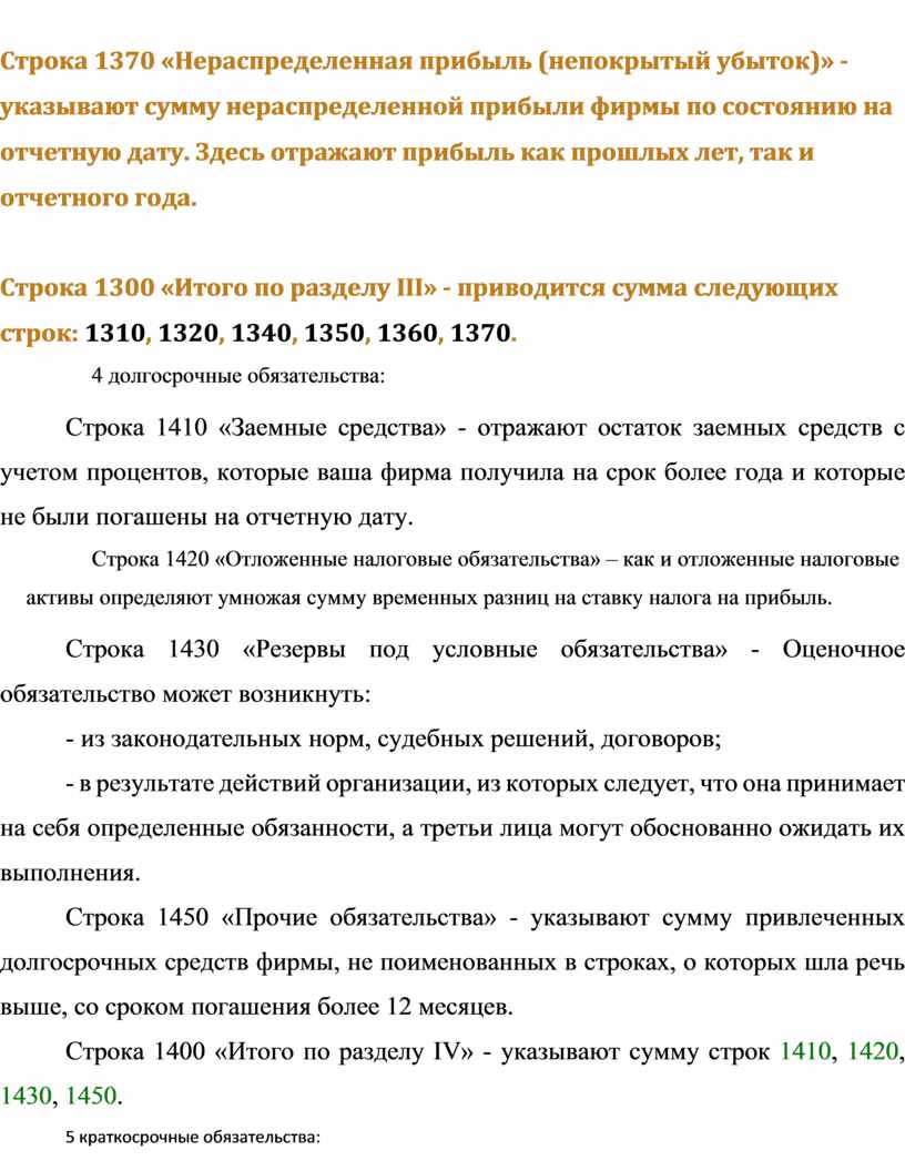 Строка 1450 «Прочие обязательства» - указывают сумму привлеченных долгосрочных средств фирмы, не поименованных в строках, о которых шла речь выше, со сроком погашения более 12 месяцев.