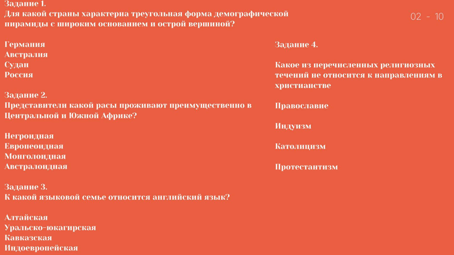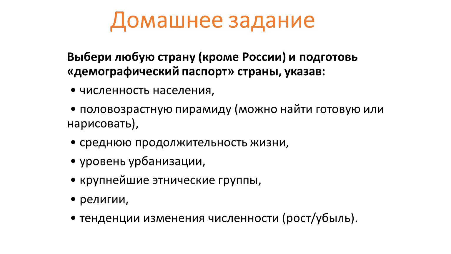 Выбери любую страну (кроме России) и подготовь «демографический паспорт» страны, указав: