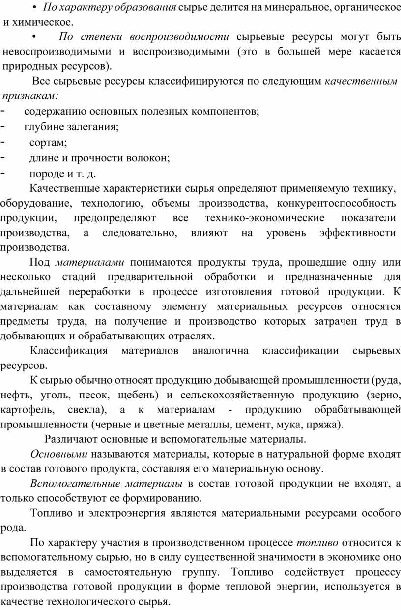 Под сырьем (сырым материалом) понимают всякий предмет труда, на добычу и производство которого затрачен труд и который в процессе переработки изменяет свою натуральную форму, приобретая все новые качественные свойства.