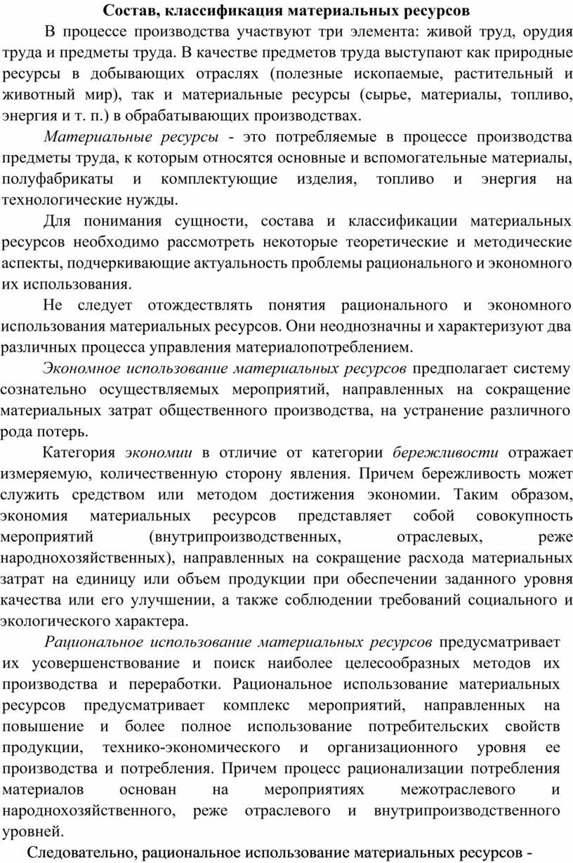 Для понимания сущности, состава и классификации материальных ресурсов необходимо рассмотреть некоторые теоретические и методические аспекты, подчеркивающие актуальность проблемы рационального и экономного их использования.
