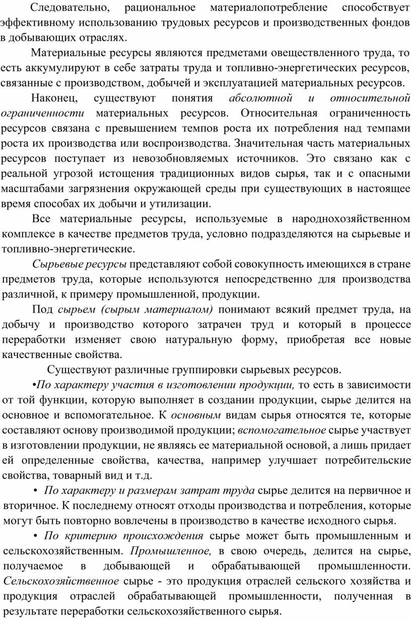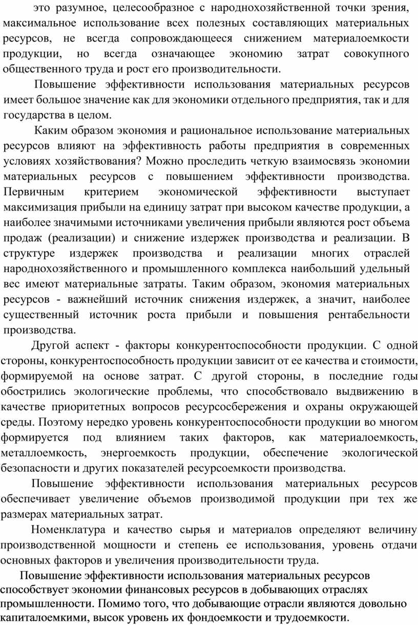 Экономное использование материальных ресурсов предполагает систему сознательно осуществляемых мероприятий, направленных на сокращение материальных затрат общественного производства, на устранение различного рода потерь.