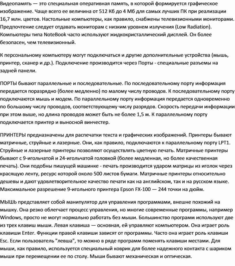 Видеопамять — это специальная оперативная память, в которой формируется графическое изображение. Чаще всего ее величина от 512 Кб до 4 Мб для самых лучших ПК при реализации 16,7 млн. цветов. Настольные компьютеры, как правило, снабжены телевизионными мониторами. Предпочтение следует отдавать мониторам с низким уровнем излучения (Low Radiation). Компьютеры типа NoteBook часто используют жидкокристаллический дисплей. Он более безопасен, чем телевизионный.
