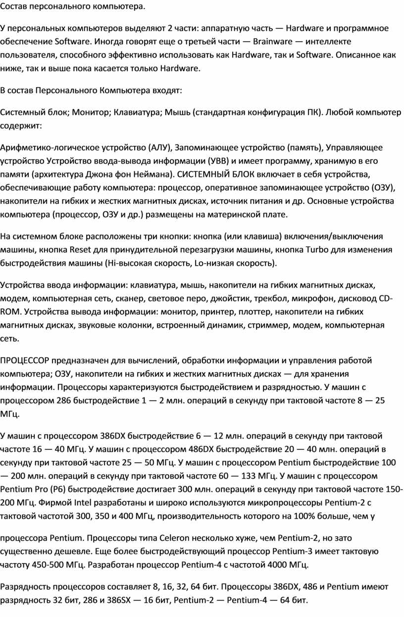 ПРОЦЕССОР предназначен для вычислений, обработки информации и управления работой компьютера; ОЗУ, накопители на гибких и жестких магнитных дисках — для хранения информации. Процессоры характеризуются быстродействием и разрядностью. У машин с процессором 286 быстродействие 1 — 2 млн. операций в секунду при тактовой частоте 8 — 25 МГц.