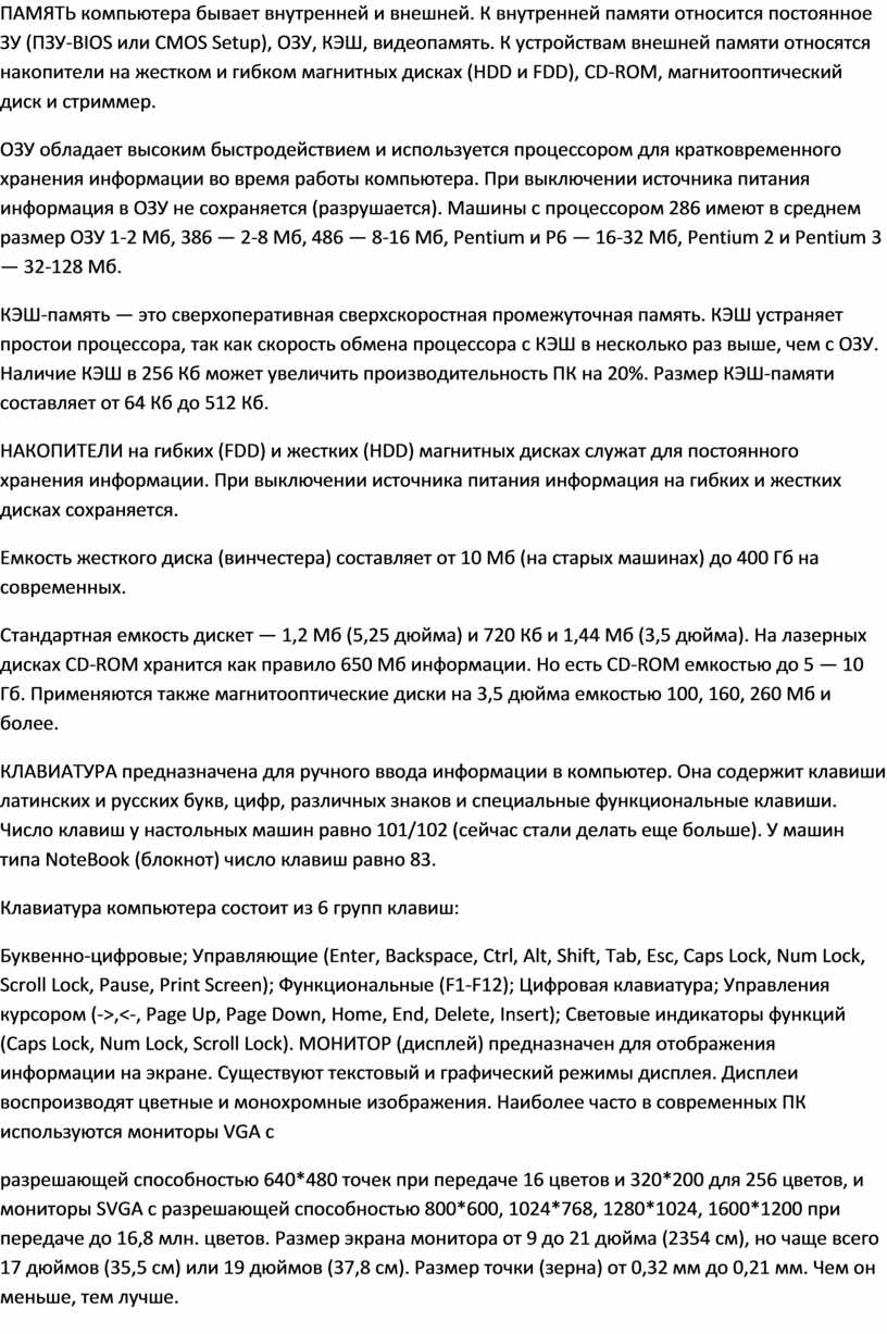 ПАМЯТЬ компьютера бывает внутренней и внешней. К внутренней памяти относится постоянное ЗУ (ПЗУ-BIOS или CMOS Setup), ОЗУ, КЭШ, видеопамять. К устройствам внешней памяти относятся накопители на жестком и гибком магнитных дисках (HDD и FDD), CD-ROM, магнитооптический диск и стриммер.
